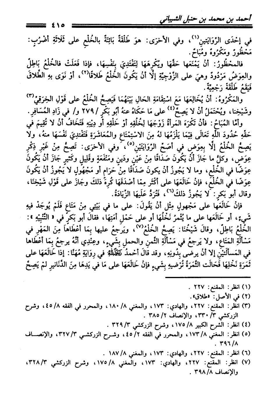 (¬7) انظر: المقنع: 227، والهادي: 173، والمغني 8/ 175، وشرح الزركشي 3/ 328، والإنصاف 8/ 398.