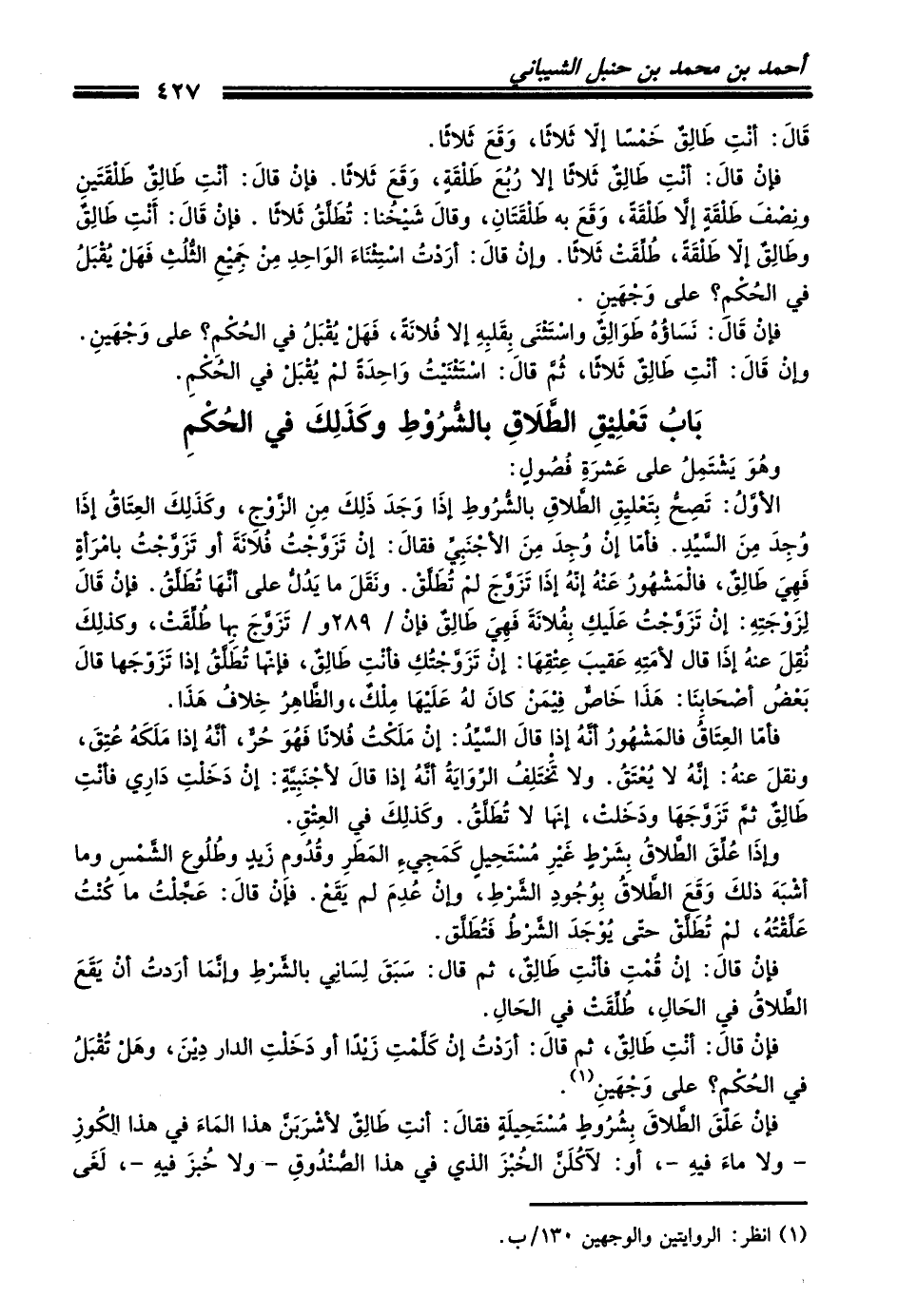 الأوَّلُ: تَصِحُّ بِتَعْليِقِ الطَّلاقِ بالشُّرُوطِ إذَا وَجَدَ ذَلِكَ مِنِ الزَّوْجِ، وكَذَلِكَ العِتَاقُ إذَا وُجِدَ مِنَ السَّيِّدِ. فأمّا إنْ وُجِدَ مِنَ الأجْنَبِيِّ فقالَ: إنْ تَزَوَّجْتُ فُلانَةَ أو تَزَوَّجْتُ بامْرَأةٍ فَهِيَ طَالِقٌ، فالْمَشْهُورُ عَنْهُ إنّهُ إذَا تَزَوَّجَ لمْ تُطَلَّقْ. ونَقَلَ ما يَدُلُّ على أنَّهَا تُطَلَّقُ. فإنْ قَالَ لِزَوْجَتِهِ: إنْ تَزَوَّجْتُ عَلَيكِ بِفُلانَةَ فَهِيَ طَالِقٌ فإنْ / 289و / تَزَوَّجَ بِها طُلِّقَتْ، وكذلِكَ نُقِلَ عنهُ إذَا قال لأمَتِهِ عَقيبَ عِتْقِهَا: إنْ تَزَوَّجْتُكِ فأنْتِ طَالِقٌ، فإنّها تُطَلَّقُ إذا تَزَوّجَها قالَ بَعْضُ أصْحَابِنَا: هَذَا خَاصٌّ فِيْمَنْ كانَ لهُ عَلَيْهَا مِلْكٌ، والظَّاهِرُ خِلافُ هَذَا.