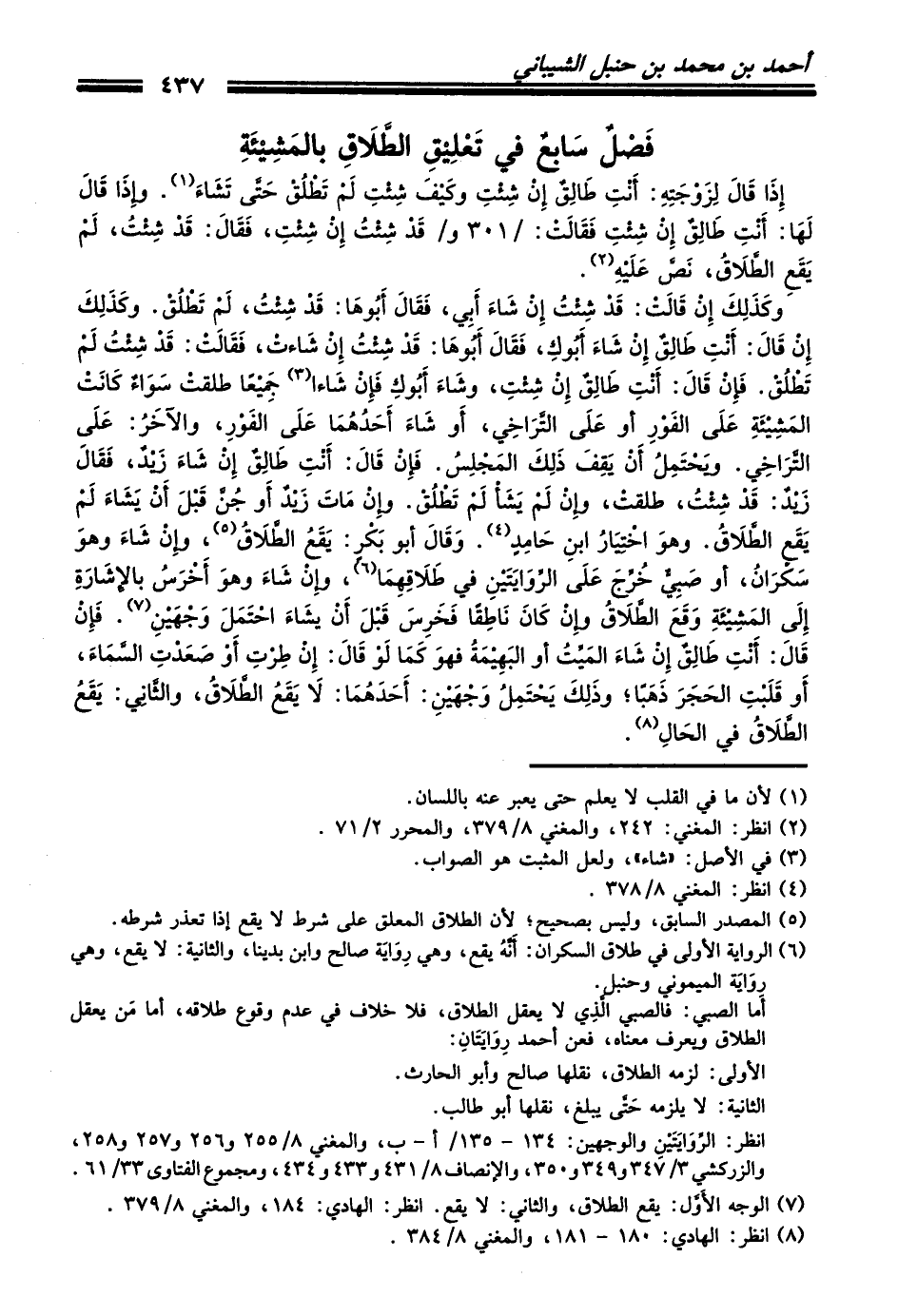فَصْلٌ سَابِعٌ في تَعْلِيْقِ الطَّلاَقِ بالمَشِيْئَةِ