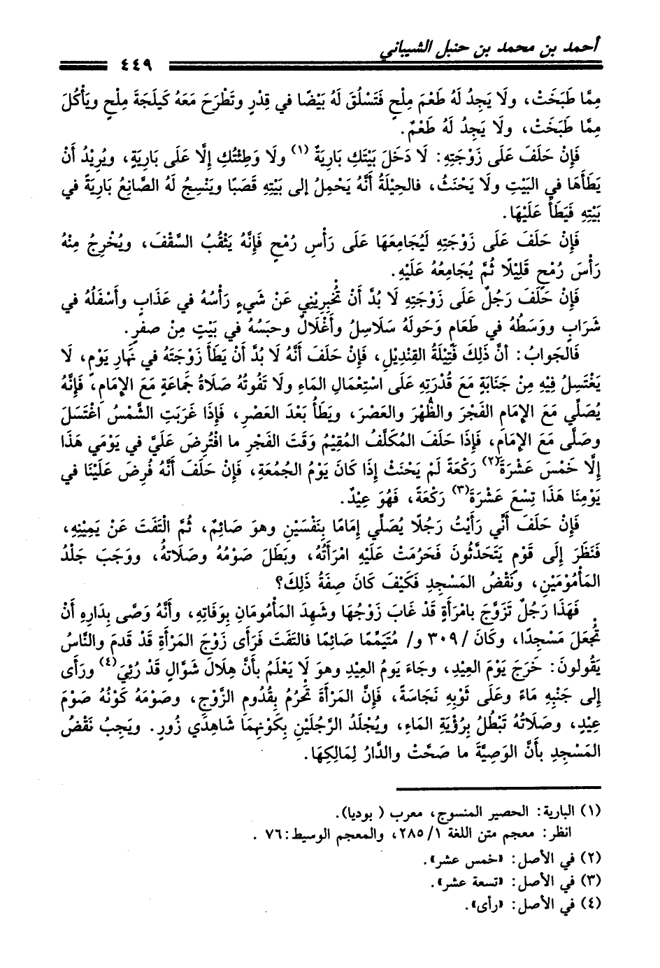 فَهَذَا رَجُلٌ تَزَوَّجَ بامْرَأَةٍ قَدْ غَابَ زَوْجُهَا وشَهِدَ المَأْمُومَانِ بِوَفَاتِهِ، وأَنَّهُ وَصَّى بِدَارِهِ أَنْ تُجْعَلَ مَسْجِداً، وكَانَ /309 و/ مُتَيَمِّماً صَائِماً فالتَفَتَ فَرَأَى زَوْجَ المَرْأَةِ قَدْ قَدمَ والنَّاسُ يَقُولونَ: خَرَجَ يَوْمَ العِيْدِ، وجَاءَ يَومُ العِيْدِ وهوَ لاَ يَعْلَمُ بأَنَّ هِلاَلَ شَوَّالٍ قَدْ رُئِيَ (¬4) ورَأَى إِلى جَنْبِهِ مَاءً وعَلَى ثَوْبِهِ نَجَاسَةً، فَإِنَّ المَرْأَةَ تَحْرُمُ بِقُدُومِ الزَّوْجِ، وصَوْمَهُ كَوْنُهُ صَوْمَ عِيْدٍ، وصَلاَتُهُ تَبْطُلُ بِرُؤْيَةِ المَاءِ، ويُجْلَدُ الرَّجُلَيْنِ بِكَوْنِهِمَا شَاهِدَي زُورٍ. ويَجِبُ نَقْضُ المَسْجِدِ بأَنَّ الوَصِيَّةَ ما صَحَّتْ والدَّارُ لِمَالِكِهَا.