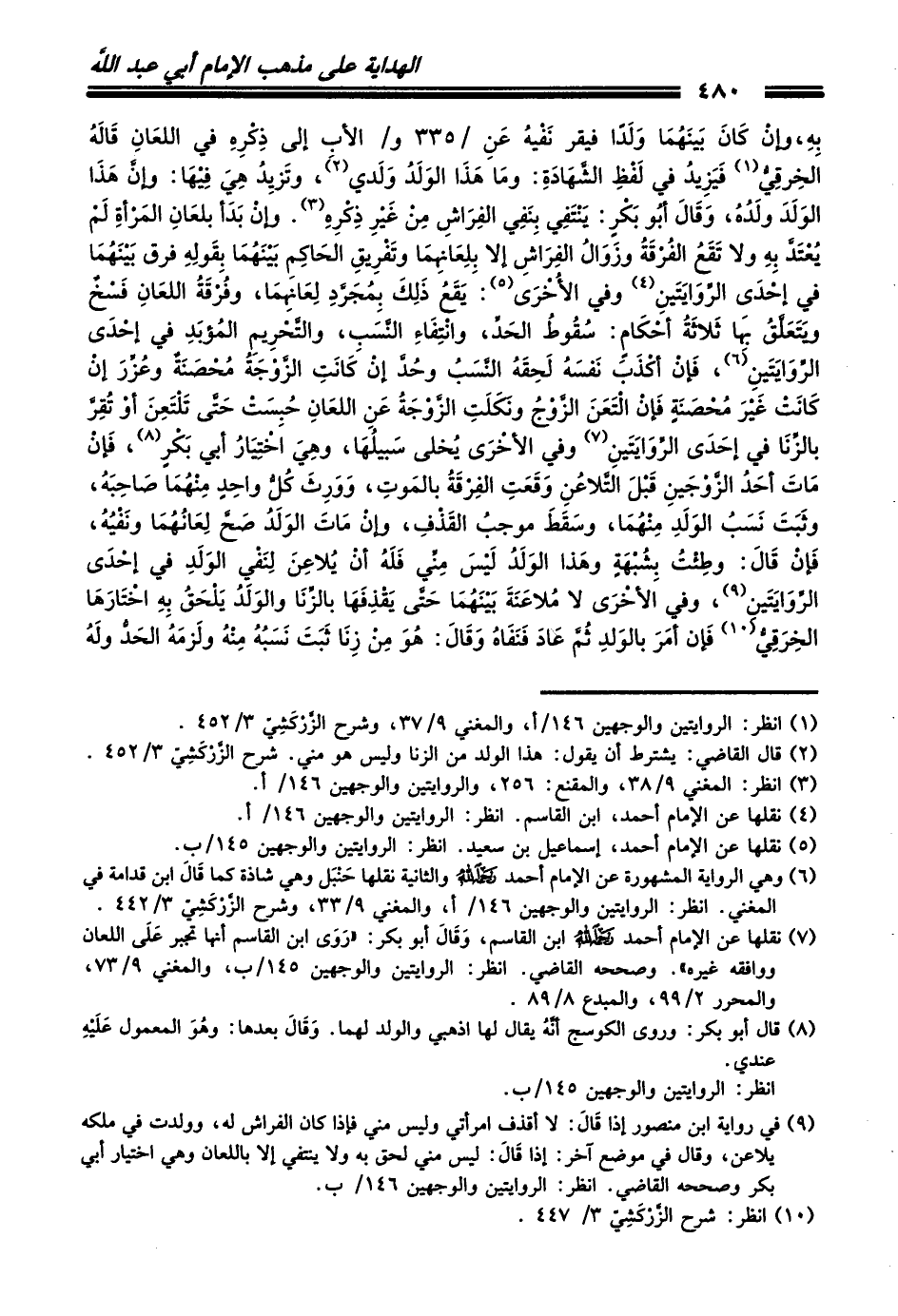 بِهِ، وإنْ كَانَ بَينَهُمَا وَلَدَاً فيقر نَفْيهُ عَنِ /335 و/ الأبِ إلى ذِكْرِهِ في اللعَانِ قَالَهُ الخِرقِيُّ (¬1) فَيَزِيدُ في لَفْظِ الشَّهَادَةِ: ومَا هَذَا الوَلَدُ وَلَدي (¬2)، وتَزيِدُ هِيَ فِيْهَا: وإنَّ هَذَا الوَلَدَ ولَدُهُ، وَقَالَ أبُو بَكْرٍ: يَنْتَفِي بِنَفِي الفِرَاشِ مِنْ غَيْرِ ذِكْرِهِ (¬3). وإنْ بَدَأ بلعَانِ المَرْأةِ لَمْ يُعْتَدَّ بِهِ ولا تَقَعُ الفُرْقَةُ وزَوَالُ الفِرَاشِ إلا بِلِعَانِهِمَا وتَفْرِيقِ الحَاكِمِ بَيْنَهُمَا بِقَولِهِ فرق بَيْنَهُمَا في إحْدَى الرِّوَايَتَينِ (¬4) وفي الأُخْرَى (¬5): يَقَعُ ذَلِكَ بِمُجَرَّدِ لِعَانِهِمَا، وفُرْقَةُ اللعَانِ فَسْخٌ ويَتَعَلَّقُ بِهَا ثَلاثَةُ أحْكَامٍ: سُقُوطُ الحَدِّ، وانْتِفَاءِ النَّسَبِ، والتَّحْرِيمِ المُؤبَدِ في إحْدَى الرِّوَايَتَينِ (¬6)، فَإنْ أكْذَبَ نَفسَهُ لَحِقَهُ النَّسَبُ وحُدَّ إنْ كَانَتِ الزَّوْجَةُ مُحْصَنَةٌ وعُزِّرَ إنْ كَانَتْ غَيْرَ مُحْصَنَةٍ فَإنْ الْتَعَنَ الزَّوْجُ ونَكَلَتِ الزَّوْجَةُ عَنِ اللعَانِ حُبِسَتْ حَتَّى تَلْتَعِنَ أوْ تُقِرَّ بالزِّنَا في إحَدَى الرِّوَايَتَينِ (¬7) وفي الأخْرَى يُخلى سَبيلُهَا، وهِيَ اخْتِيَارُ أبي بَكْرٍ (¬8)، فَإنْ مَاتَ أحَدُ الزَّوْجَينِ قَبْلَ التَّلاعُنِ وَقَعَتِ الفِرْقَةُ بالمَوتِ، وَوَرِثَ كُلُّ واحِدٍ مِنْهُمَا صَاحِبَهُ، وثَبَتَ نَسَبُ الوَلَدِ مِنْهُمَا، وسَقَطَ موجبُ القَذْفِ، وإنْ مَاتَ الوَلَدُ صَحَّ لِعَانُهُمَا ونَفْيُهُ، فَإنْ قَالَ: وطِئْتُ بِشُبْهَةٍ وهَذا الوَلَدُ لَيْسَ مِنِّي فَلَهُ أنْ يُلاعِنَ لِنَفْي الوَلَدِ في إحْدَى الرِّوَايَتَينِ (¬9)، وفي الأخْرَى لا مُلاعَنَةَ بَيْنَهُمَا حَتَّى يَقْذِفَهَا بالزِّنَا والوَلَدُ يَلْحَقُ بِهِ اخْتَارَهَا الخِرَقِيُّ (¬10) فَإن أمَرَ بالوَلدِ ثُمَّ عَادَ فَنَفَاهُ وَقَالَ: هُوَ مِنْ زِنَا ثَبَتَ نَسَبُهُ مِنْهُ ولَزمَهُ الحَدُّ ولَهُ