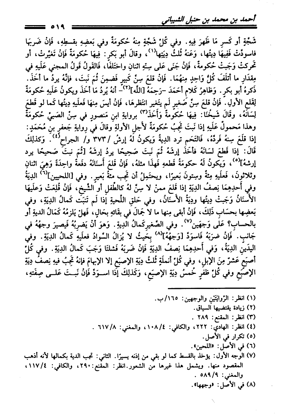 تَغيَّرتْ، أو تَحركتْ وَجَبتْ حُكومةٌ، فَإنْ جَنَى عَلى سِنّهِ اثنانِ واختَلفَا، فَالقَولُ قَولُ المجني عَلَيهِ في مِقدَارِ ما أتلَفَ كُلُّ وَاحِدٍ مِنهُمَا. فَإنْ قلعَ سِنَّ كَبيرٍ فَضمِنَ ثُمَ نَبتَ، فإنَّهُ يردُ ما أخَذَ. ذَكرهُ أبو بكرٍ. وَظاهِرُ كَلامِ أحَمَدَ -رَحِمَهُ [الله] (¬2) - أنهُ يُردُ مَا أخَذَ ويكونُ عَلَيهِ حُكومَةٌ لِقَلعِ الأولِ. فَإنْ قلعَ سِنَّ صَغيرٍ لَم يتَغير انتَظرهَا، فَإنْ أيسَ مِنهَا فَعلَيهِ دِيتُها كَما لو قَطعَ لِسَانهُ، وقَالَ شَيخُنَا: فِيهَا حُكومةٌ وَأَخَذَ (¬3) بروايةِ ابنِ مَنصورٍ في سِنِّ الصَبيِّ حُكومَةٌ وهذا مَحمولٌ عَلَيهِ إذا نَبتَ تَجِبُ حُكومَةٌ لأَجلِ الأولةِ وقالَ في رِوايةِ جَعفرٍ بنِ مُحَمَدٍ: إذا قلَعَ سِنهُ فَردَّهُ، فَالتَحَم ترد الدِيةُ وَيكونُ لهُ إرشُ /373 و/ الجراحِ (¬4). وَكذلِكَ قَالَ: إذا قَطعَ لسَانَهُ فأخَذَ إرشَهُ ثُمَ نَبتَ صَحِيحَاً يردُ إرشَهُ [ثُمَ نبتَ صَحيحَاً يرد إرشهُ] (¬5)، وَيكونُ لَهُ حكومَةُ قَطعهِ فَهذَا مثلهُ، فَإنْ قَلعَ أَسنَانَهُ دفَعةً واحِدَةً وَهِيَ اثنانِ وثلاثونَ، فَعلَيهِ مِئةٌ وسِتونَ بَعيرَاً، ويحتَمِلُ أن تَجِب مئةُ بَعيرٍ. وفي [اللحيين] (¬6) الدِيَةُ وفي أَحدِهِمَا نِصفُ الدِيَةِ إذا قَلعَ ممنْ لا سِنَّ لهُ كالطِّفلِ أو الشَّيخِ، فَإنْ قُلِعَتْ وَعلَيهَا الأَسنَانُ وَجَبتْ دِيتُها ودِيَةُ الأَسنَانُ، وفي حَلقِ اللِّحيةِ إذا لَم تَنبَت كَمالُ الدِيَةِ، وفي بَعضِها بحسَابِ ذَلِكَ، فَإنْ أبقى مِنها ما لا جَمالَ في بقَائهِ بحَالٍ، فَهلْ يَلزمُهُ كَمَالُ الديةِ أو بالحسابِ؟ عَلى وَجهَين (¬7). وفي الصَّغيرِكَمالُ الدِيةِ. وَهوَ أنْ يَضرِبُهُ فَيصيرَ وجهُهُ في جَانبٍ. فَإنْ ضرَبَهُ فَاسوَدَّ [وَجهُهُ] (¬8) بِحَيثُ لا يُزالُ السَّوادُ فعلَيهِ كَمالُ الدِيَةِ. وفي اليدَينِ الدِيَةُ، وَفي أَحدِهِمَا نِصفُ الدِيَةِ فَإنْ ضَربَهُ فَشلتَا وَجَبَ كَمالُ الدِيَةِ. وفي كُلِّ أصبَعٍ عَشرٌ مِنَ الإبلِ، وفي كُلِّ أنملَةٍ ثُلثُ دِيَةِ الإصبَعِ إلا الإبهامَ فإنهُ تَجِبُ فيهِ نِصفُ دِيَةِ الإصبَعِ وفي كُلِّ ظفرٍ خُمسُ دِيَةِ الإصبَعِ، وَكَذلِكَ إذا اسوَدَّ فَإنْ