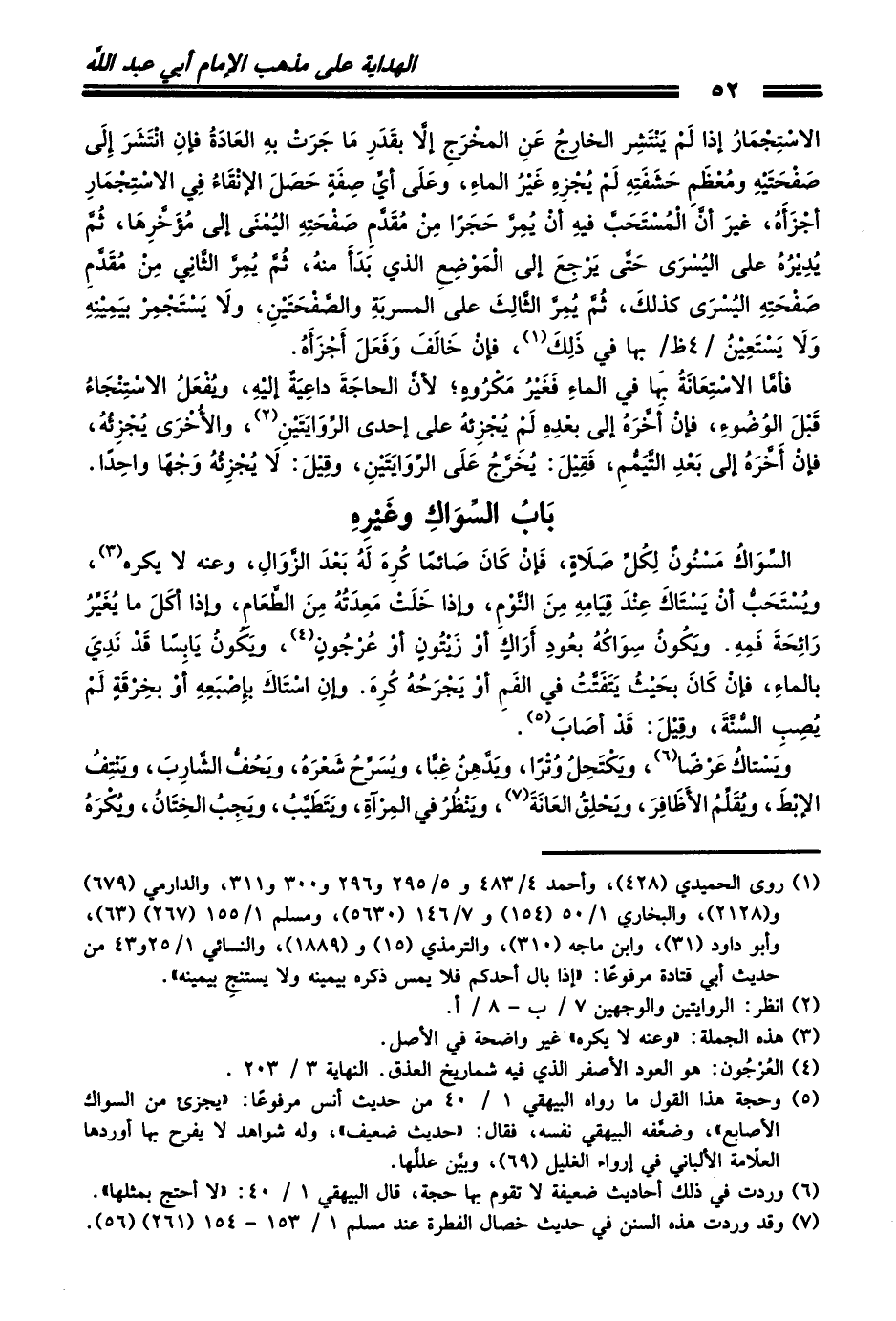 (¬1) روى الحميدي (428)، وأحمد 4/ 483 و 5/ 295 و296 و300 و311، والدارمي (679) و (2128)، والبخاري 1/ 50 (154) و 7/ 146 (5630)، ومسلم 1/ 155 (267) (63)، وأبو داود (31)، وابن ماجه (310)، والترمذي (15) و (1889)، والنسائي 1/ 25و43 من حديث أبي قتادة مرفوعاً: ((إذا بال أحدكم فلا يمس ذكره بيمينه ولا يستنجِ بيمينه)).