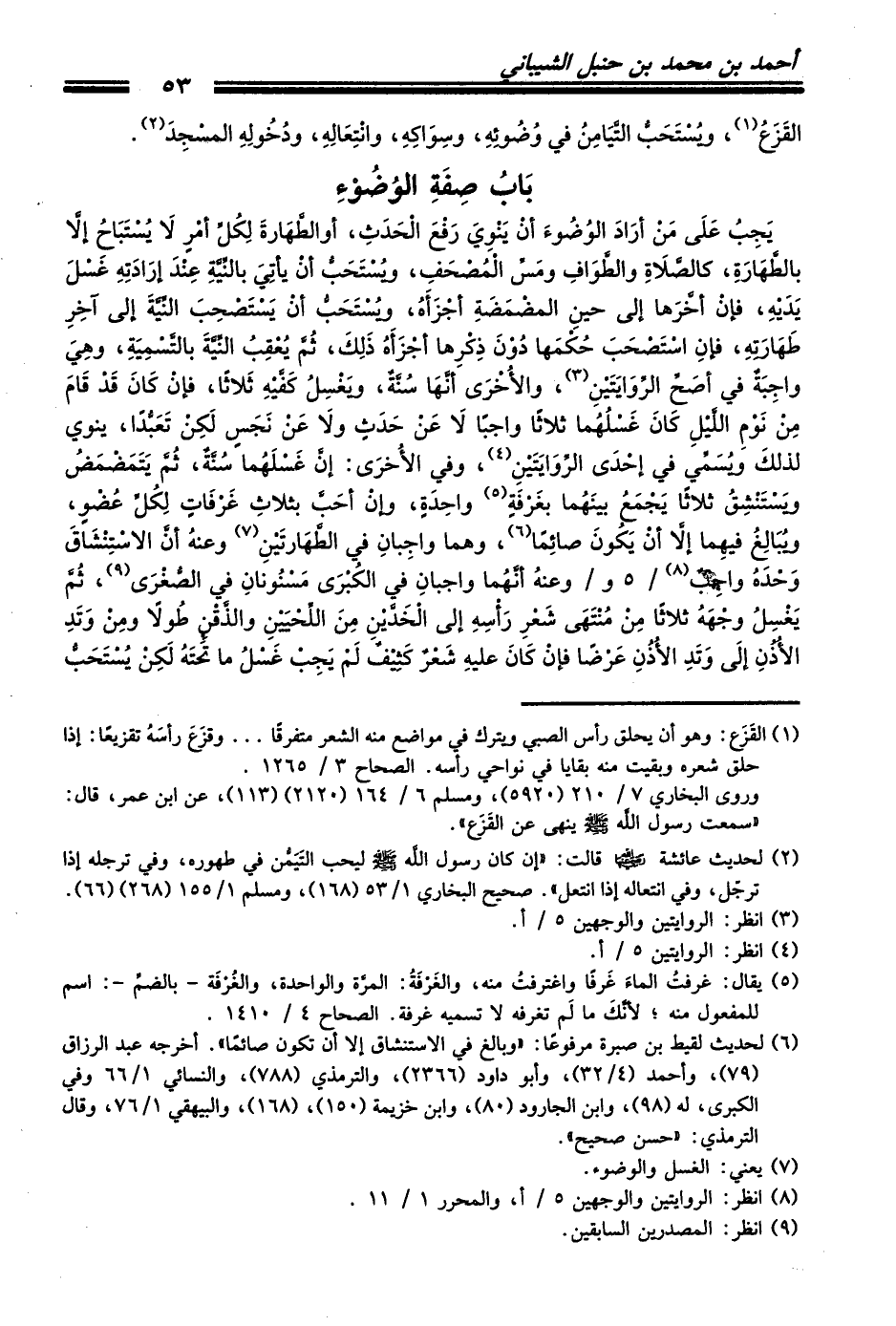 يَجِبُ عَلَى مَنْ أرَادَ الوُضُوءَ أنْ يَنْوِيَ رَفْعَ الْحَدَثِ، أوالطَّهَارةَ لِكُلِّ أمْرٍ لاَ يُسْتَبَاحُ إلاَّ بالطَّهَارَةِ، كالصَّلاَةِ والطَّوَافِ ومَسِّ الْمُصْحَفِ، ويُسْتَحَبُّ أنْ يأتِيَ بالنِّيَّةِ عِنْدَ إرَادَتِهِ غَسْلَ يَدَيْهِ، فإنْ أخَّرَها إلى حينِ المضْمَضَةِ أجْزَأَهُ، ويُسْتَحَبُّ أنْ يَسْتَصْحِبَ النِّيَّةَ إلى آخِرِ طَهَارَتِهِ، فإنِ اسْتَصْحَبَ حُكْمَها دُوْنَ ذِكْرِها أجْزَأَهُ ذَلِكَ، ثُمَّ يُعْقِبُ النِّيَّةَ بالتَّسْمِيَةِ، وهِيَ واجِبَةٌ في أصَحِّ الرِّوَايَتَيْنِ (¬3)، والأُخْرَى أنَّهَا سُنَّةٌ، ويَغْسِلُ كَفَّيْهِ ثَلاثاً، فإنْ كَانَ قَدْ قَامَ مِنْ نَوْمِ اللَّيْلِ كَانَ غَسْلُهُما ثلاثاً واجباً لاَ عَنْ حَدَثٍ ولاَ عَنْ نَجَسٍ لَكِنْ تَعَبُّداً، ينوي لذلكَ ويُسَمِّي في إحْدَى الرِّوَايَتَيْنِ (¬4)، وفي الأُخرَى: إنَّ غَسْلَهُما سُنَّةٌ، ثُمَّ يَتَمَضْمَضُ ويَسْتَنْشِقُ ثلاثاً يَجْمَعُ بينَهُما بغَرْفَةٍ (¬5) واحِدَةٍ، وإنْ أحَبَّ بثلاثِ غَرْفَاتٍ لِكُلِّ عُضْوٍ، ويُبَالِغُ فيهِما إلاَّ أنْ يَكُونَ صائِماً (¬6)، وهما واجِبانِ في الطَّهَارتَيْنِ (¬7) وعنهُ أنَّ الاسْتِنْشَاقَ وَحْدَهُ واجِبٌ (¬8) / 5 و / وعنهُ أنَّهُما واجبانِ في الكُبْرَى مَسْنُونانِ في الصُّغْرَى (¬9)، ثُمَّ يَغْسِلُ وجْهَهُ ثلاثاً مِنْ مُنْتَهَى شَعْرِ رَأْسِهِ إلى الْخَدَّيْنِ مِنَ اللِّحْيَيْنِ والذَّقْنِ طُولاً ومِنْ وَتَدِ الأُذُنِ إلَى وَتَدِ الأُذُنِ عَرْضاً فإنْ كَانَ عليهِ شَعْرٌ كَثِيْفٌ لَمْ يَجِبْ غَسْلُ ما تَحْتَهُ لَكِنْ يُسْتَحَبُّ