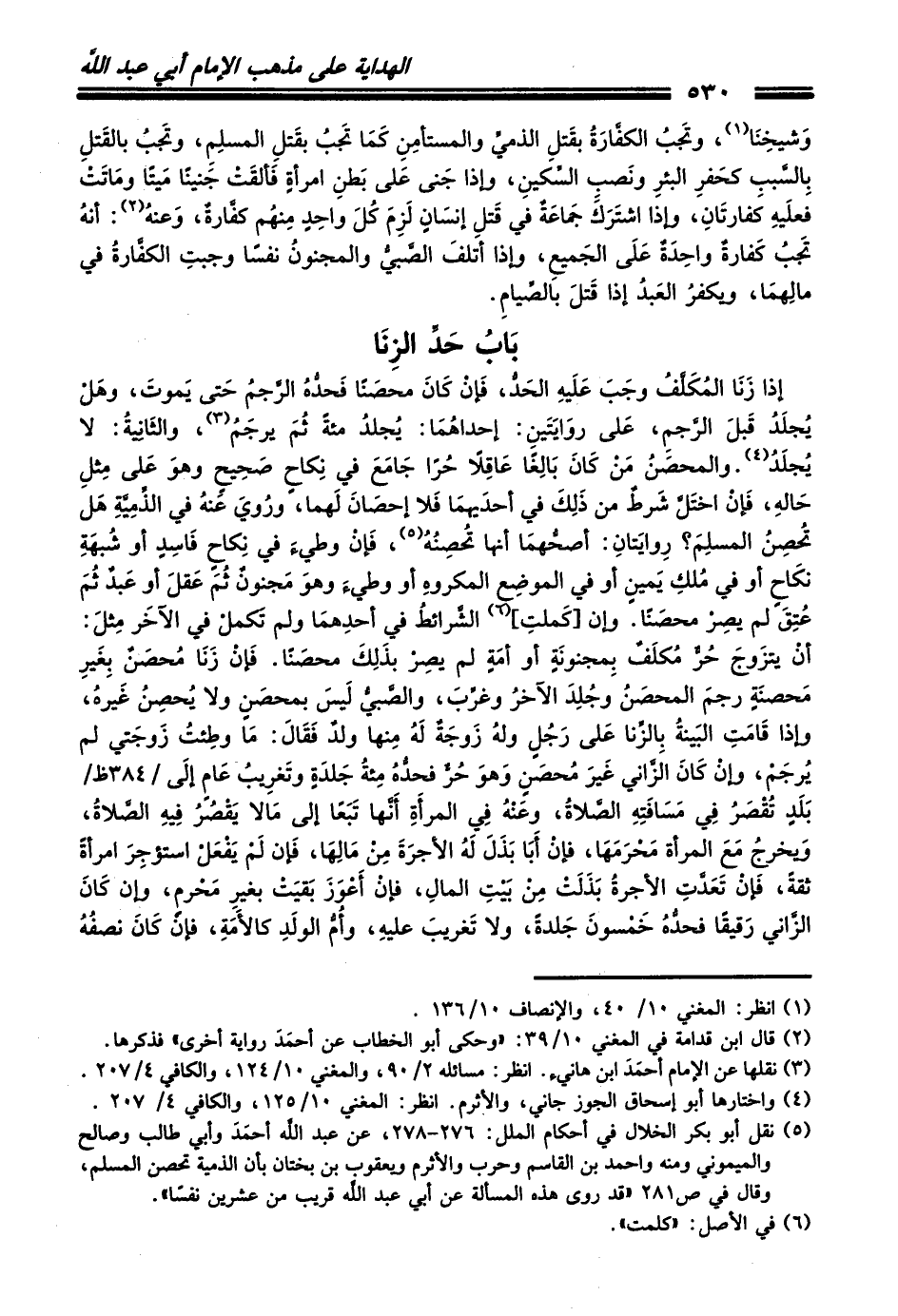 إذا زَنَا المُكَلَّفُ وجَبَ عَلَيهِ الحَدُّ، فَإنْ كَانَ محصَناً فَحدُّهُ الرَّجمُ حَتى يَموتَ، وهَلْ يُجلَدُ قَبلَ الرَّجمِ، عَلى روَايَتَينِ: أَحدُهُمَا: يُجلدُ مئةً ثُمَ يرجَمُ (¬3)، والثَانِيةُ: لا يُجلَدُ (¬4). والمحصَنُ مَنْ كَانَ بَالِغاً عَاقِلاً حُرَاً جَامَعَ في نِكاحٍ صَحِيحٍ وهوَ عَلى مِثلِ حَالهِ، فَإنْ اختَلَّ شَرطٌ من ذَلِكَ في أحدَيهمَا فَلا إحصَانَ لَهما، ورُويَ عَنهُ في الذِّمِيَّةِ هَل تُحصِنُ المسلِمَ؟ رِوايَتانِ: أصحُّهمَا أنها تُحصِنُهُ (¬5)، فَإنْ وطيءَ في نِكاحٍ فَاسِدٍ أو شُبهَةِ نكَاحٍ أو في مُلكِ يَمينٍ أو في الموضِعِ المكروهِ أو وطيءَ وهوَ مَجنونٌ ثُمَ عَقلَ أو عَبدٌ ثُمَ عُتِقَ لم يصِرْ محصَناً. وإن [كَملتِ] (¬6) الشَّرائطُ في أحدِهمَا ولم تَكملْ في الآخَر مِثلَ: أنْ يتزَوجَ حُرٌّ مُكلَفٌ بِمجنونَةٍ أو أمَةٍ لم يصِرْ بذَلِكَ محصَناً. فَإنْ زَنَا مُحصَنٌ بِغَيرِ مَحصنَةٍ رجمَ المحصَنُ وجُلِدَ الآخرُ وغرِّبَ، والصَّبيُّ لَيسَ بمحصَنٍ ولا يُحصِنُ غَيرهُ، وإذا قَامَتِ البَينةُ بِالزِّنا عَلى رَجُلٍ ولهُ زَوجَةٌ لَهُ مِنها ولدٌ فَقَالَ: مَا وطِئتُ زَوجَتي لم يُرجَمْ، وإنْ كَانَ الزَّاني غَيرَ مُحصَنٍ وَهوَ حُرٌّ فحدُّهُ مِئةُ جَلدَةٍ وتَغرِيبُ عَامٍ إلَى /384ظ /بَلَدٍ تُقْصَرُ فِي مَسَافَتِهِ الصَّلاةُ، وعَنْهُ فِي المرأَةِ أَنَّها تَبَعَاً إلى مَالا يَقْصُرُ فِيهِ الصَّلاةُ، وَيخرجُ مَعَ المرأة مَحْرَمَهَا، فإنْ أَبَا بَذَلَ لَهُ الأجرَةَ مِنْ مَالِهَا، فَإن لَمْ يَفْعَلْ استؤجِرَ امرأةً ثقةً، فَإنْ تَعَدَّتِ الأجرةُ بَذَلَتْ مِنْ بَيْتِ المالِ، فإنْ أَعْوَزَ بَقيَتْ بغيرِ مَحْرمٍ، وإن كَانَ الزَّاني رَقيقَاً فحدُّهُ خَمْسونَ جَلدةً، ولا تَغريبَ عليهِ، وأُمُّ الولَدِ كالأَمَةِ، فإنْ كَانَ نصفُهُ