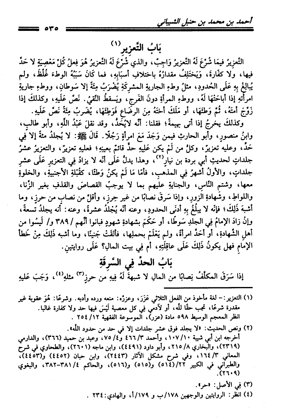 وكذلكَ يخرجُ إذا أتى بهيمةً؛ فقلنا: أنَّه لايُحَدُّ، وقد نقلَ عَبْدُ اللهِ، وأبو طالبٍ، وابنُ منصورٍ، وأبو الحارثِ فيمن وَجَدَ مَعَ امرأةٍ رَجُلاً. قَالَ - صلى الله عليه وسلم -: لا يُجلدُ مئةً إلا فِي حَدٍّ، وعليه تعزيرٌ، وكلُّ من لَمْ يكن عَلِيهِ حدٌّ قائمٌ بعينِهِ؛ فعليهِ تعزيرٌ، والتعزيرُ عشرُ جلداتٍ لحديثِ أبي بردة بن نيارٍ (¬2)، وهذا يدلُّ عَلَى أنّه لا يزادُ فِي التعزيرِ عَلَى عشرِ جلداتٍ، والأولُ أشهرُ فِي المذهبِ، فأمّا مَا لَمْ يكنُ وَطئاً، كقُبْلةِ الأجنبيةِ، والخلوةِ معها، وشتمِ النَّاسِ، والجنايةِ عليهم بما لا يوجبُ القصاصَ والقذفِ بغير الزِّنا، واللواطِ، وشهادةِ الزورِ، وإذا سَرقَ نصاباً من غير حِرزٍ، وأقلَّ من نصابٍ من حرزٍ، وما أشبهَ ذَلِكَ؛ فإنّه لا يبلُغُ بِهِ أدنَى الحدودِ، وعنه أنّه يُجْلدُ عشرةً، وعنه: أنه يجلدُ تسعةً، وإنْ زادَ الإمامُ فِي الجلدِ سَوطاً، أو حَكَمَ بشهادةِ شهودٍ فبانوا أنَّهم /389 و/ لَيسُوا من أهلِ الشَّهادةِ، أو أحَدَّ امرأةً، ولم يَعْلَمْ بحملِها، فألقَتْ جَنينَاً، وما أشبه ذَلِكَ مِنْ خَطأ الإمامِ فهل يكونُ ذَلِكَ عَلَى عاقِلَتِهِ، أم فِي بيت المالِ؟ عَلَى روايتينِ.