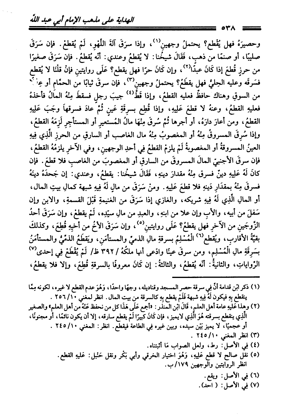 (¬5) نقل صالح لا قطع عَلِيهِ، وَهُوَ اختيار الخرقي وأبي بَكْر ونقل حَنْبل: عَليهِ القطع.