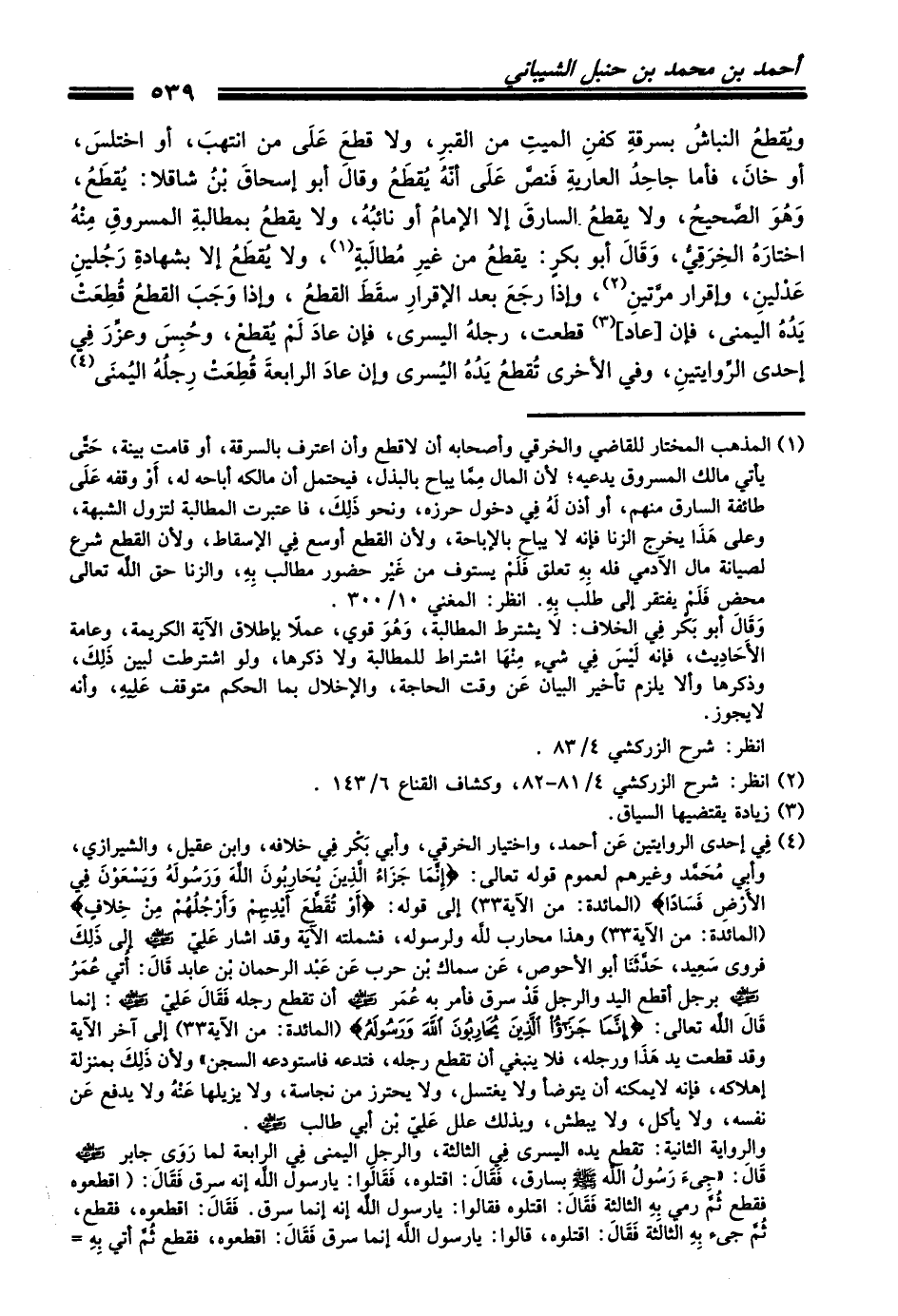 ويُقطعُ النباشُ بسرقةِ كفنِ الميتِ من القبرِ، ولا قطعَ عَلَى من انتهبَ، أو اختلسَ، أو خانَ، فأما جاحِدُ العاريةِ فَنصَّ عَلَى أنّهُ يُقطَعُ وقالَ أبو إسحاقَ بْنُ شاقلا: يُقطَعُ، وَهُوَ الصَّحيحُ، ولا يقطعُ السارقَ إلا الإمامُ أو نائبُهُ، ولا يقطعُ بمطالبةِ المسروقِ مِنْهُ اختارَهُ الخِرَقِيُّ، وَقَالَ أبو بكرٍ: يقطعُ من غيرِ مُطالَبةٍ (¬1)، ولا يُقطَعُ إلا بشهادةِ رَجُلينِ عَدْلينِ، وإقرار مرَّتينِ (¬2)، وإذا رجَعَ بعد الإقرارِ سقَطَ القطعُ، وإذا وَجَبَ القطعُ قُطِعَتْ يَدُهُ اليمنى، فإن [عاد] (¬3) قطعت، رجلهُ اليسرى، فإن عادَ لَمْ يُقطعْ، وحُبِسَ وعزِّرَ فِي إحدى الرِّوايتينِ، وفي الأخرى تُقطعُ يَدُهُ اليُسرى وإن عادَ الرابعةَ قُطِعَتْ رِجلُهُ اليُمنَى (¬4)