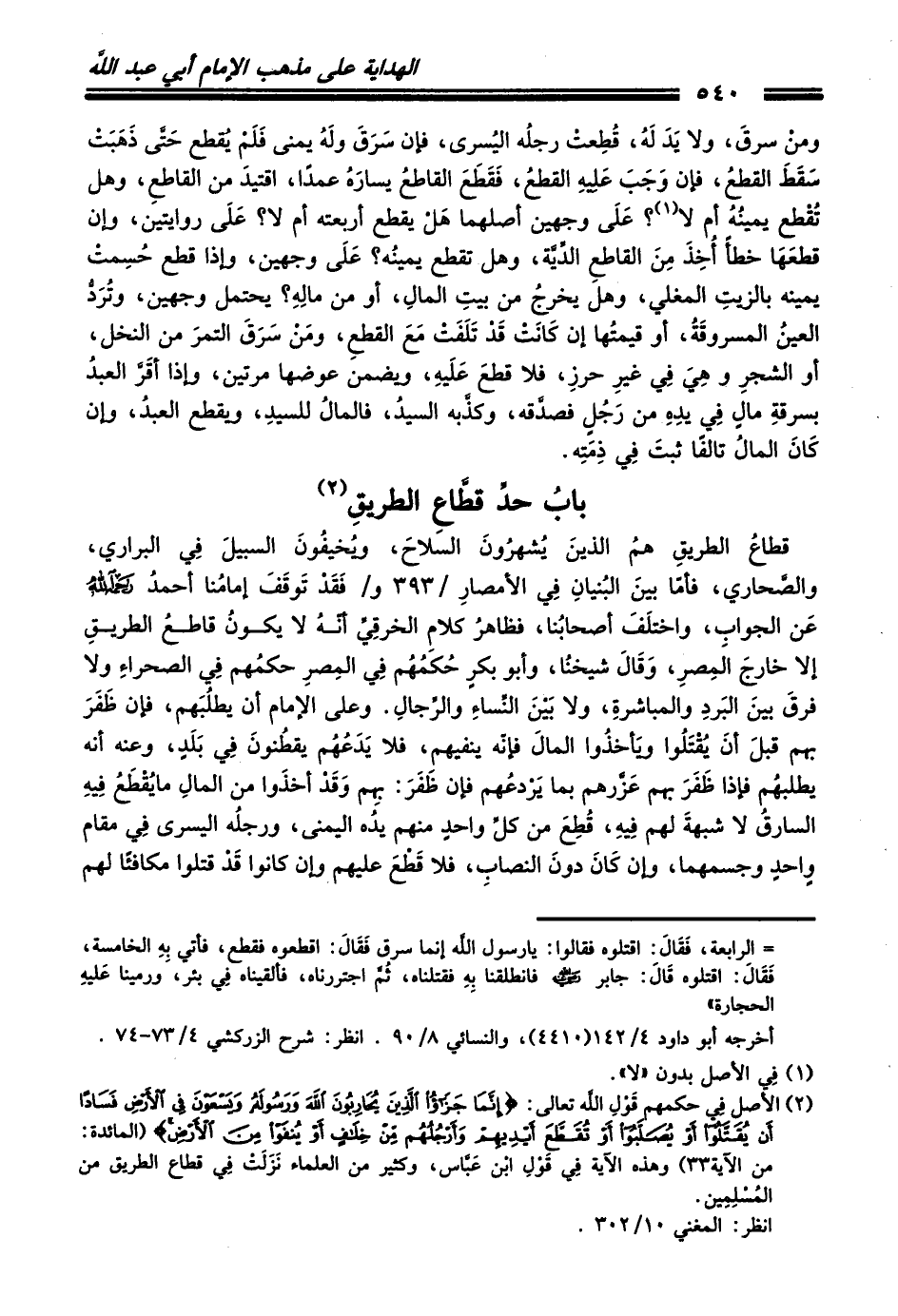 قطاعُ الطريقِ همُ الذينَ يُشهرُونَ السلاحَ، ويُخيفُونَ السبيلَ فِي البراري، والصَّحاري، فأمّا بينَ البُنيانِ فِي الأمصارِ /393 و/ فَقَدْ تَوقَفَ إمامُنا أحمدُ -رَحِمَهُ الله- عَن الجوابِ، واختلَفَ أصحابُنا، فظاهرُ كلامِ الخرقِيِّ أنّهُ لا يكونُ قاطعُ الطريقِ إلا خارجَ المِصرِ، وَقَالَ شيخنُا، وأبو بكرٍ حُكمُهُم فِي المِصرِ حكمُهم فِي الصحراءِ ولا فرقَ بينَ البَردِ والمباشرةِ، ولا بَيْنَ النِّساءِ والرِّجالِ. وعلى الإمام أن يطلُبَهم، فإن ظَفَرَ بهم قبلَ أنَ يُقْتَلُوا ويَأخذُوا المالَ فإنّه ينفيهم، فلا يَدَعُهُم يقطُنونَ فِي بَلَدٍ، وعنه أنه يطلبهُم فإذا ظَفَرَ بهم عَزَّرهم بما يَرْدعُهم فإن ظَفَرَبِهم وَقَدْ أخذَوا من المالِ مايُقْطَعُ فِيهِ السارقُ لا شبهةَ لهم فِيهِ، قُطِعَ من كلِّ واحدٍ منهم يدُه اليمنى، ورجلُه اليسرى فِي مقام ٍواحدٍ وجسمهما، وإن كَانَ دونَ النصابِ، فلا قَطْعَ عليهم وإن كانوا قَدْ قتلوا مكافئاً لهم