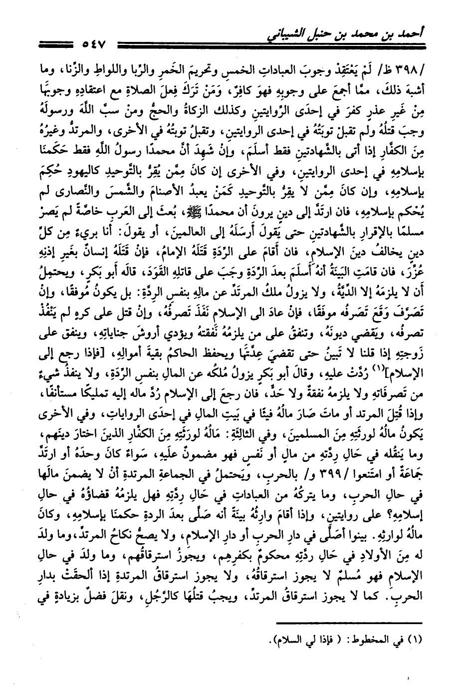 /398 ظ/ لَمْ يَعْتَقِدْ وجوبَ العباداتِ الخمسِ وتحريمَ الخَمرِ والرِّبا واللواطِ والزِّنا، وما أشبهَ ذلكَ، ممَّا أجمعَ على وجوبِهِ فهوَ كافِرٌ، وَمَنْ تَرَكَ فِعلَ الصلاةِ مع اعتقادِهِ وجوبَهَا مِنْ غَيرِ عذرٍ كفرَ في إحدَى الرِّوايتينِ وكذلك الزكاةُ والحجُّ ومنْ سبَّ اللهَ ورسولَهُ وجبَ قتلُهُ ولم تقبلْ توبَتُهُ في إحدى الروايتينِ، وتقبلُ توبتُهُ في الأخرى، والمرتدُّ وغيرُهُ مِنَ الكفَّارِ إذا أتى بالشَّهادتينِ فقط أسلَمَ، وإنْ شَهِدَ أنَّ محمداً رسولُ اللهِ فقط حَكَمنَا بإسلامِهِ في إحدى الروايتينِ، وفي الأخرى إن كانَ مِمَّن يُقِرُّ بالتَّوحيدِ كاليهودِ حُكِمَ بإسلامِهِ، وإن كانَ مِمَّن لا يقِرُّ بالتَّوحيدِ كَمَنْ يعبدُ الأصنامَ والشَّمسَ والنَّصارى لم يُحْكم بإسلامِهِ، فان ارتَدَّ إلى دينٍ يرونَ أن محمداً - صلى الله عليه وسلم -، بُعثَ إلى العَربِ خاصَّةً لم يَصرْ مسلماً بالإقرارِ بالشَّهادتينِ حتى يَقولَ أَرسَلَهُ إلى العالمينَ، أو يقولَ: أنا بريءٌ مِن كلِّ دينٍ يخالفُ دينَ الإسلامِ، فان أَقامَ على الرِّدَةِ قَتَلَهُ الإمامُ، فإنْ قَتَلَهُ إنسانٌ بغَيرِ إذنِهِ عُزِّرَ، فان قامَتِ البَينَةُ أنهُ أَسلَمَ بعدَ الرِّدَةِ وجَبَ على قاتلِهِ القَوَدَ، قالَه أَبو بَكرٍ، ويحتمِلُ أَن لا يلزمَهُ إلا الدِّيَّةُ، ولا يزولُ ملكُ المرتَدِّ عن مالِهِ بنفسِ الرِدَّةِ: بل يكونُ مُوفقاً، وإنْ تَصَرَّفَ وَقَعَ تَصَرفُهُُ موفَقَاً، فإنْ عادَ الى الإسلامِ نَفَذَ تَصرفُهُ، وإنْ قتل على كرهٍ لم يَنْفُذْ تصرفُه، ويَقضي ديونَهُ، وتنفقُ على من يلزمُهُ نَفقتهُ ويؤدي أروشَ جناياتِهِ، وينفق على زَوجتِهِ إذا قلنا لا تَبينُ حتى تقضيَ عِدَّتَهَا ويحفظ الحاكمُ بقيةَ أموالِهِ، [فإذا رجع إلى الإسلام] (¬1) رُدَّتْ عليهِ، وقالَ أبو بَكرٍ يزولُ مُلكُه عن المالِ بنفسِ الرِّدَةِ، ولا ينفذُ شيءٌ من تَصرفَاتهِ ولا يلزمهُ نفقةٌ ولا حَدٌّ، فان رجعَ إلى الإسلام رُدَّ ماله إليه تمليكاً مستأنفاً، وإذا قُتِلَ المرتد أو ماتَ صَارَ مالُهُ فيئاً في بَيتِ المالِ في إحدَى الرواياتِ، وفي الأخرى يَكونُ مالُهُ لورثَتِهِ مِنَ المسلمينَ، وفي الثالِثَةِ: مَالُهُ لورَثَتِهِ مِنَ الكفَّارِ الذينَ اختارَ دينَهم، وما يَنقُله في حَالِ رِدَّتهِ من مالٍ أو نَفسٍ فهو مضمونٌ علَيهِ، سَواءٌ كانَ وحدَهُ أو ارتَدَّ جَماعَةٌ أو امتَنعوا /399 و/ بالحربِ، ويَحتملُ في الجماعةِ المرتدةِ أنْ لا يضمنَ مالَها في حالِ الحربِ، وما يتركُهُ من العباداتِ في حَالِ رِدَّتِهِ فهل يلزمُهُ قضاؤُهُ في حالِ إسلامِهِ؟ على روايتينِ، وإذا أقامَ وأرِثُهُ بينَةً أنه صَلَّى بعدَ الردةِ حكمنَا بإسلامِهِ، وكانَ مالُهُ لوارثِهِ. بينوا أصَلَّى في دارِ الحربِ أو دارِ الإسلامِ، ولا يصحُّ نكاحُ المرتدِّ، وما ولدَ له مِنَ الأولادِ في حَالِ ردَّتِهِ محكومٌ بكفرِهِم، ويجوزُ استرقاقُهم، وما ولدَ في حالِ الإسلامِ فهو مُسلمٌ لا يجوز استرقاقُهُ، ولا يجوز استرقاقُ المرتدةِ إذا ألحقَتْ بدارِ الحربِ. كما لا يجوز استرقاقُ المرتدِّ، ويجبُ قتلُهَا كالرَّجُلِ، ونقلَ فضلٌ بزيادةٍ في