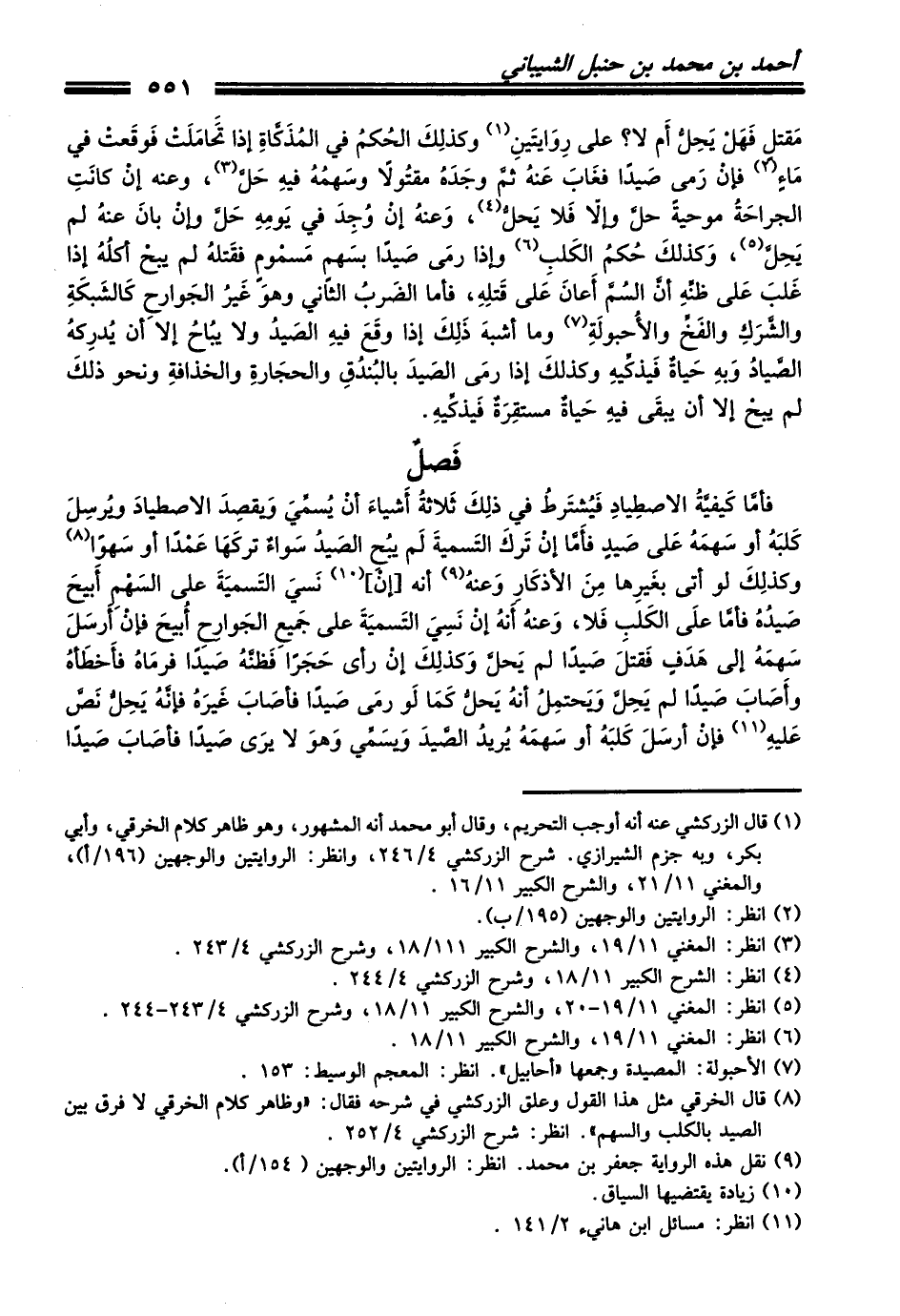 (¬8) قال الخرقي مثل هذا القول وعلق الزركشي في شرحه فقال: ((وظاهر كلام الخرقي لا فرق بين الصيد بالكلب والسهم)). انظر: شرح الزركشي 4/ 252.