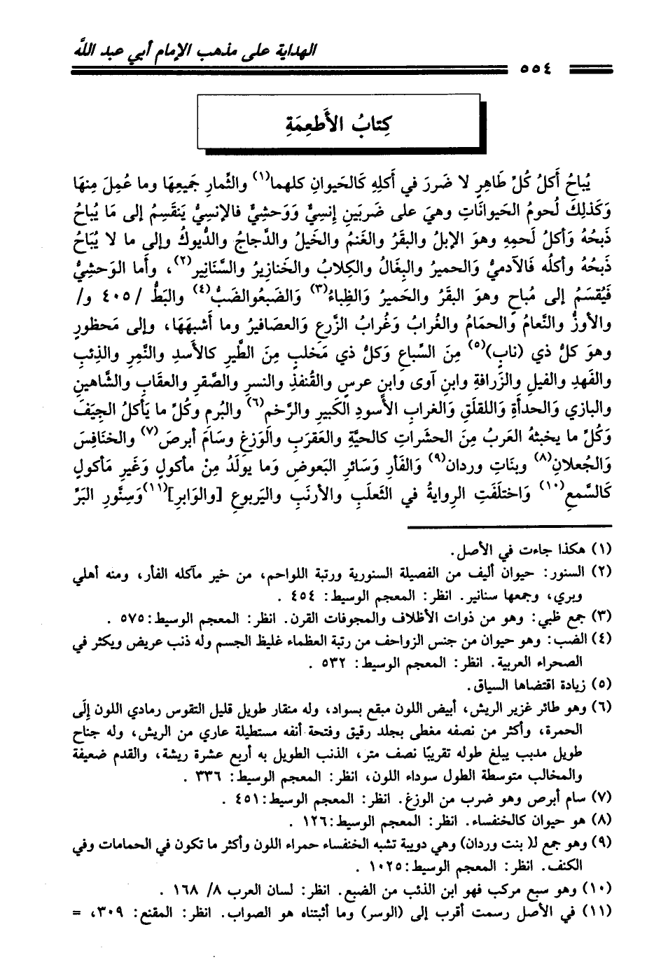 يُباحُ أَكلُ كُلِّ طَاهِرٍ لا ضَررَ في أَكلِهِ كَالحَيوانِ كلهما (¬1) والثِّمارِ جَميعِهَا وما عُمِلَ مِنهَا وَكَذلِكَ لُحومُ الحَيوانَاتِ وهيَ على ضَربَينِ إِنسِيٌّ وَوَحشِيٌّ فالإنسِيُّ يَنقَسِمُ إلى مَا يُباحُ ذَبحُهُ وَأكلُ لَحمِهِ وهوَ الإبلُ والبقَرُ والغَنمُ والخَيلُ والدَّجاجُ والدُّيوكُ وإلى ما لا يُبَاحُ ذَبحُهُ وأكلُه فَالآدميُّ وَالحميرُ والبِغَالُ والكِلابُ والخَنازِيرُ والسَّنَانِير (¬2)، وأَما الوَحشِيُّ فَيُقسَمُ إلى مُباحٍ وهوَ البقَرُ والحَميرُ وَالظِباءُ (¬3) وَالضَبعُ والضَبُّ (¬4) والبَطُّ /405 و/ والأوزُّ والنَّعامُ والحمَامُ والغُرابُ وَغُرابُ الزَّرعِ وَالعصَافيرُ وما أَشبهَهَا، وإلى مَحظورٍ وهوَ كلُّ ذي (نابٍ ((¬5) مِنَ السِّباعِ وَكلُّ ذي مَخلبٍ مِنَ الطَّيرِ كالأَسدِ والنَّمِرِ والذِئبِ والفَهدِ والفيلِ والزَرافةِ وابنِ آوى وابنِ عرسٍ والقُنفذِ والنسرِ والصَّقرِ والعقَابِ والشَّاهينِ والبازي وَالحدأَةِ وَاللقلَقِ وَالغرابِ الأَسودِ الكَبيرِ والرَّخمِ (¬6) والبُرمِ وكُلِّ ما يَأكلُ الجِيَفَ وَكُلِّ ما يخبثهُ العَربُ مِنَ الحشَراتِ كالحيَّةِ والعَقرَبِ والوَزغِ وسَامَ أبرصَ (¬7) والخنَافِسَ وَالجُعلانِ (¬8) وبنَاتِ وردان (¬9) وَالفَأرِ وَسَائرِ البَعوضِ وَما يولَدُ مِنْ مأكولٍ وَغَيرِ مَأكولٍ كَالسَّمعِ (¬10) وَاختلَفَتِ الرِوايةُ في الثَعلَبِ والأرنَبِ واليَربوعِ [والوَابرِ] (¬11) وَسِنَّورِ البَرِّ