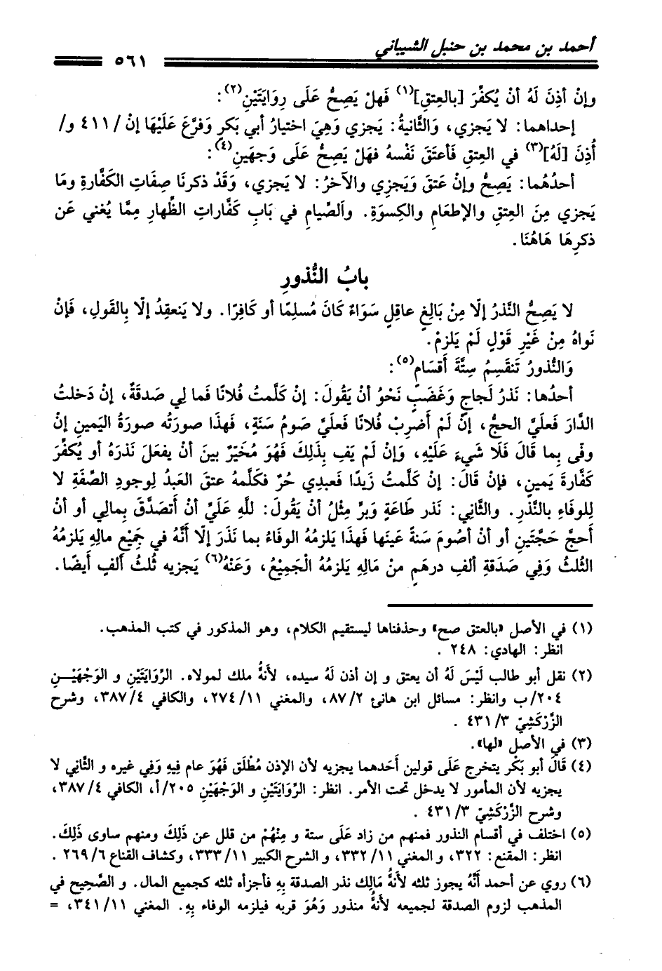 (¬5) اختلف في أقسام النذور فمنهم من زاد عَلَى ستة ومِنْهُمْ من قلل عن ذَلِكَ ومنهم ساوى ذَلِكَ.