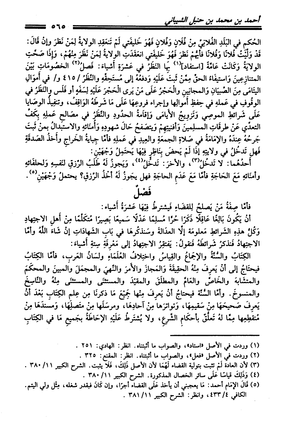 أنْ يَكُونَ بَالِغاً عَاقِلاً ذَكَراً حُرَّاً مُسلِمَاً عَدْلاً سَميعَاً بَصِيراً مُتكَلِّمَاً مِنْ أَهلِ الاجتِهادِ وَكُلُّ هذِهِ الشَرائطِ مَعلومَةٌ إلاَّ العدَالةَ وسَنذكُرهَا في بَابِ الشَهادَاتِ إنْ شَاءَ اللهُ وأمَّا الاجتِهادُ فَنذكرُ شَرائطَهُ فَنقولُ: يَفتقِرُ الاجتِهادُ إلى مَعْرِفَةِ سِتةِ أَشياءَ:
