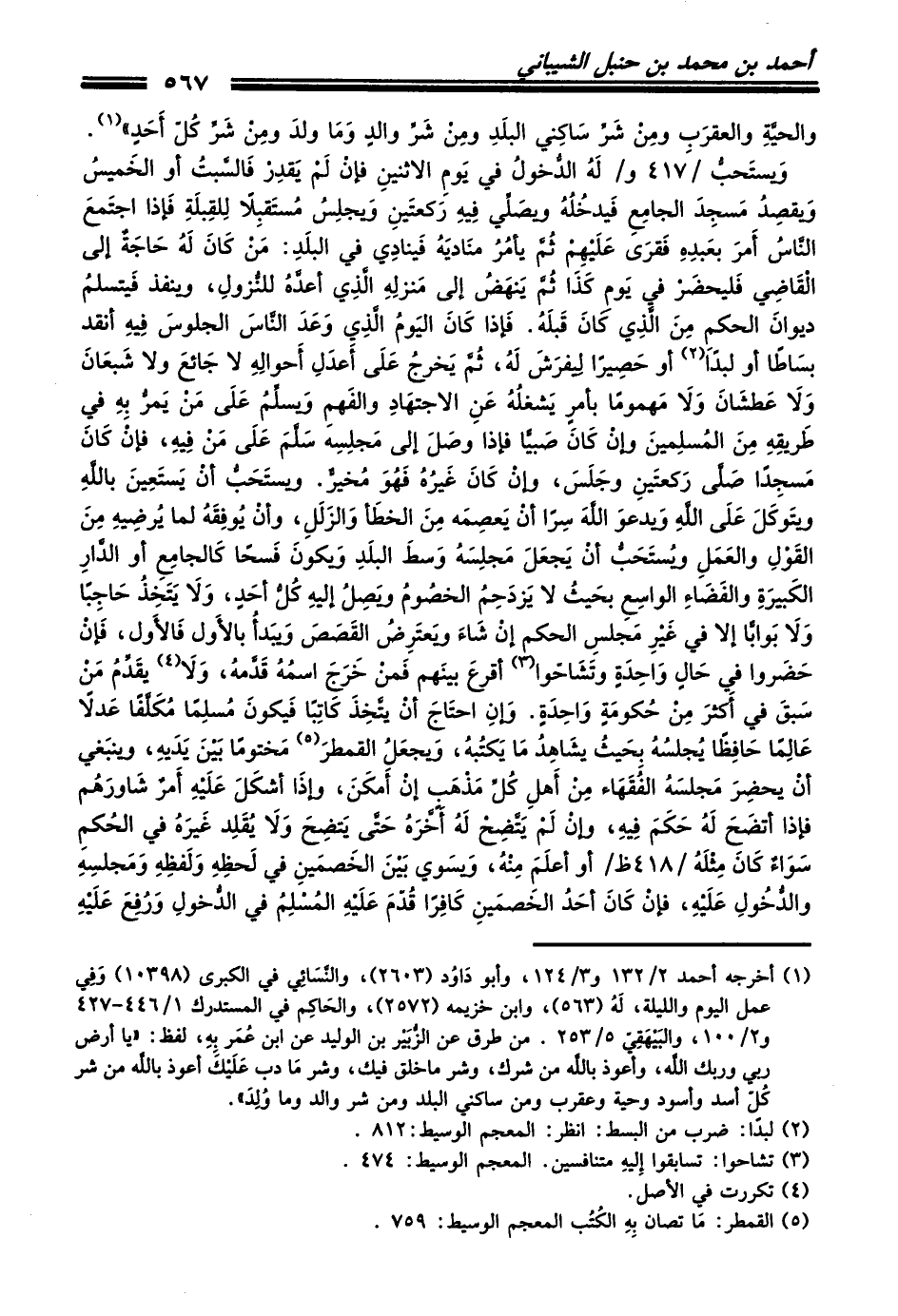 (¬1) أخرجه أحمد 2/ 132 و3/ 124، وأبو دَاوُد (2603)، والنَّسَائِيّ في الكبرى (10398) وَفِي عمل اليوم والليلة، لَهُ (563)، وابن خزيمه (2572)، والحَاكِم في المستدرك 1/ 446 - 427 و 2/ 100، والبَيْهَقِيّ 5/ 253. من طرق عن الزُّبَيْر بن الوليد عن ابن عُمَر بِهِ، لفظ: ((يا أرض ربي وربك الله، وأعوذ بالله من شرك، وشر ماخلق فيك، وشر مَا دب عَلَيْكَ أعوذ بالله من شر كُلّ أسد وأسود وحية وعقرب ومن ساكني البلد ومن شر والد وما وُلِدَ)).