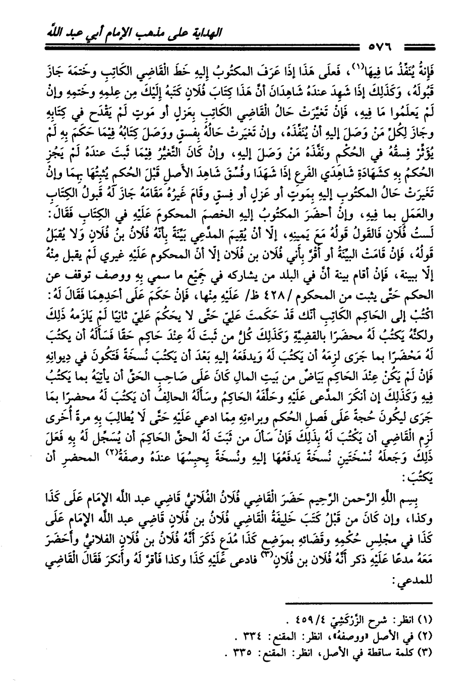 بِسِم اللهِ الرَّحمن الرَّحِيم حَضَرَ الْقَاضِي فُلاَنُ الفُلاَنيُّ قَاضِي عبد الله الإِمَام عَلَى كَذَا وكذا، وإن كَانَ من قَبْلُ كَتَبَ خَلِيفَةُ الْقَاضِي فُلاَنُ بن فُلاَنٍ قَاضِي عبد الله الإِمَامِ عَلَى كَذَا في مجْلِسِ حُكْمِهِ وقَضَائهِ بموَضِعِ كَذَا مُدَعٍ ذَكَرَ أَنَّهُ فُلاَنُ بن فُلاَنٍ الفلانيُّ وأحَضَرَ مَعَهُ مدعاً عَلَيْهِ ذكر أَنَّهُ فُلاَن بن فُلاَنٍ (¬3) فادعى عَلَيْهِ كَذَا وكذا فَأقرَّ لَهُ وأَنكرَ فَقَالَ الْقَاضِي للمدعي:
