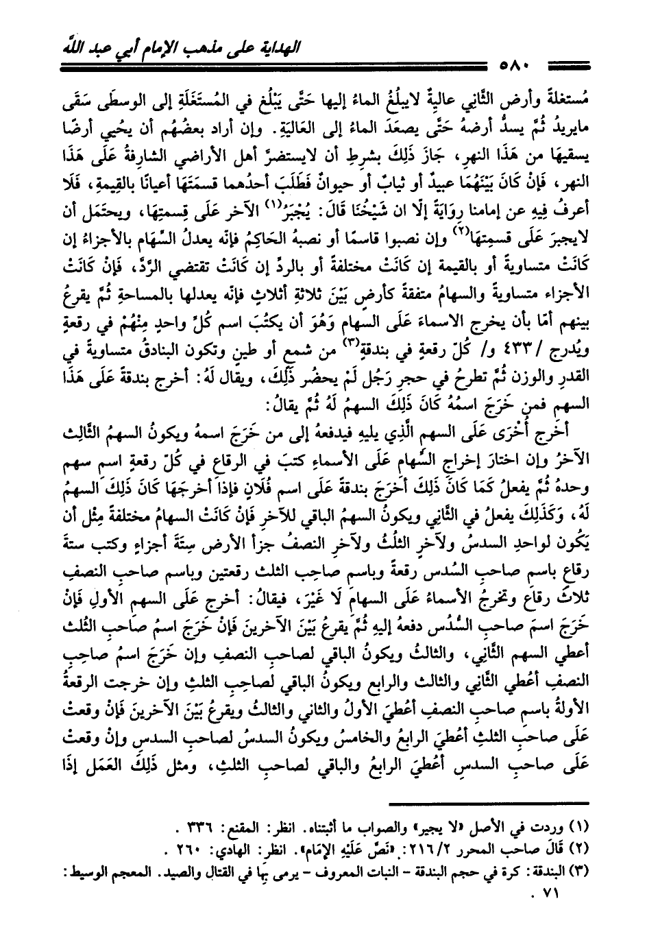 مُستغلةً وأرض الثَّانِي عاليِةٌ لايبلُغُ الماءُ إليها حَتَّى يَبْلُغ في المُستَغَلَةِ إلى الوسطَى سَقَى مايريدُ ثُمَّ يسدُّ أرضهُ حَتَّى يصعَدَ الماءُ إلى العَاليَةِ. وإن أراد بعضُهُم أن يحُيي أرضاً يسقيهَا من هَذَا النهرِ، جَازَ ذَلِكَ بشرِطِ أن لايستضرَّ أهل الأراضي الشارِفةُ عَلَى هَذَا النهر، فَإنْ كَانَ بَيْنَهُمَا عبيدٌ أو ثيابٌ أو حيوانٌ فَطَلَبَ أحدُهما قسمَتَهَا أعياناً بالقِيمةِ، فَلاَ أعرفُ فِيهِ عن إمامنا رِوَايَةً إلاّ ان شَيْخُنَا قَالَ: يُجْبَرُ (¬1) الآخر عَلَى قِسمتِهَا، ويحتَمَل أن لايجبرَ عَلَى قسمِتهَا (¬2) وإن نصبوا قاسماً أو نصبهُ الحَاكِمُ فإنّه يعدلُ السِّهَامُ بالأجزاءُ إن كَانَتْ متساويةً أو بالقيمة إن كَانَتْ مختلفةً أو بالردِّ إن كَانَتْ تقتضي الرَّدَّ، فَإنْ كَانَتْ الأجزاء متساويةً والسهامُ متفقةً كأرضٍ بَيْنَ ثلاثةِ أثلاثٍ فإنّه يعدلها بالمساحةِ ثُمَّ يقرعُ بينهم أمّا بأن يخرج الاسماءَ عَلَى السهامُ وَهُوَ أن يكتُبَ اسم كُلِّ واحدٍ مِنْهُمْ في رقعةٍ ويُدرج /433 و/ كُلّ رقعةٍ في بندقةٍ (¬3) من شمعٍ أو طينٍ وتكون البنادقُ متساويةً في القدرِ والوزن ثُمَّ تطرحُ في حجرِ رَجُل لَمْ يحضُر ذَلِكَ، ويقال لَهُ: أخرج بندقةً عَلَى هَذَا السهمِ فمن خَرَجَ اسمُهُ كَانَ ذَلِكَ السهمُ لَهُ ثُمَّ يقالُ: أخرج أُخْرَى عَلَى السهمِ الَّذِي يليهِ فيدفعهُ إلى من خَرَجَ اسمهُ ويكونُ السهمُ الثَّالِث الآخرُ وإن اختارَ إخراجِ السِّهامِ عَلَى الأسماءِ كتبَ في الرقاعِ في كُلّ رقعةٍ اسمِ سهم وحدهُ ثُمَّ يفعلُ كَمَا كَانَ ذَلِكَ أخرَجَ بندقةً عَلَى اسم فُلاَنٍ فإذا أخرجَهَا كَانَ ذَلِكَ السهمُ لَهُ، وَكَذَلِكَ يفعلُ في الثَّانِي ويكونُ السهمُ الباقي للآخرِ فَإنْ كَانَتْ السهامُ مختلفةً مِثْل أن يَكُون لواحدِ السدسُ ولآخرٍ الثلُثُ ولآخرِ النصفُ جزأ الأرض سِتَةَ أجزاءٍ وكتب ستةَ رقاعٍ باسمِ صاحبِ السُدس رقعةً وباسمِ صاحِب الثلثُ رقعتين وباسم صاحبِ النصفِ ثلاثَ رقاع وتخرجُ الأسماءُ عَلَى السهامِ لاَ غَيْرَ، فيقالُ: أخرج عَلَى السهمِ الأولِ فَإنْ خَرَجَ اسمَ صاحبِ السُّدُس دفعهُ إليهِ ثُمَّ يقرعُ بَيْنَ الآخرينَ فَإنْ خَرَجَ اسمُ صاحبِ الثُلثُ أعطي السهمُ الثَّانِي، والثالثُ ويكونُ الباقي لصاحبِ النصفِ وإن خَرَجَ اسمُ صاحِبِ النصفِ أعُطي الثَّانِي والثالثَ والرابعَ ويكونُ الباقي لصاحِبِ الثلثِ وإن خرجت الرقعةُ الأولةُ باسمِ صاحبِ النصفِ أعُطيَ الأولُ والثاني والثالثُ ويقرعُ بَيْنَ الآخرينَ فَإنْ وقعتْ عَلَى صاحبِ الثلثِ أعُطيَ الرابعُ والخامسُ ويكونُ السدسُ لصاحبِ السدسِ وإنْ وقعتْ عَلَى صاحبِ السدسِ أعُطيَ الرابعُ والباقي لصاحبِ الثلثِ، ومثلَ ذَلِكَ العَمَل إذَا