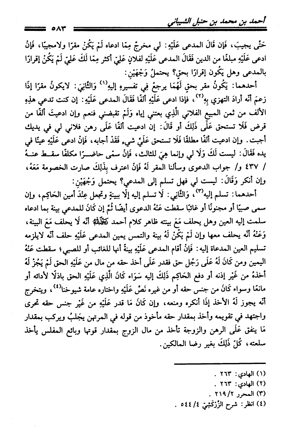 أحدهما: تسلم إليه (¬3)، وَالثَّانِيَ: لاَ تسلم إليه إلاّ ببينةٍ وتجعل عِنْدَ أمين الحَاكِم، وإن سمى صبياً أو مجنوناً أو غائباً سقطت عَنْهُ الدعوى أيضاً ثُمَّ إن كَانَ للمدعي بينة بما ادعاه سلمت إليه العين وهل يحلف مَعَ بينته ظاهر كلام أحمد -رَحِمَهُ اللهُ - أنّه لاَ يحلف مَعَ البينة، وَعَنْهُ أنّه يحلف معها وإن لَمْ يَكُنْ لَهُ بينة والتمس يمين المدعى عَلَيْهِ حلف أنّه لايلزمه تسليم العين المدعاة إليه: فَإنْ أقام المدعى عَلَيْهِ بينةً انها للغائب أو للصبي؛ سقطت عَنْهُ اليمين ومن كَانَ لَهُ عَلَى رَجُل حق فقدر عَلَى أخذ حقه من مال من عَلَيْهِ الحق لَمْ يَجُزْ لَهُ أخذهُ من غَيْر إذنه أو دفع الحَاكِم ذَلِكَ إليه سَوَاء كَانَ الَّذِي عَلَيْهِ الحق باذلاً لأدائه أو مانعاً وسواء كَانَ من جنس حقه أو من غيره نَصَّ عَلَيْهِ واختاره عامة شيوخنا (¬4)، ويتخرج أنّه يجوز لَهُ الأخذ إذَا أنكره ومنعه، وإن كَانَ مَا قدر عَلَيْهِ من غَيْر جنس حقه تحرى واجتهد في تقويمه وأخذ بمقدار حقه مأخوذ من قوله في المرتهن يجَلبُ ويركب بمقدار مَا ينفق عَلَى الرهن والزوجة تأخذ من مال الزوج بمقدار قوتها وبائع المفلس يأخذ سلعته، كُلّ ذَلِكَ بغير رضا المالكين.