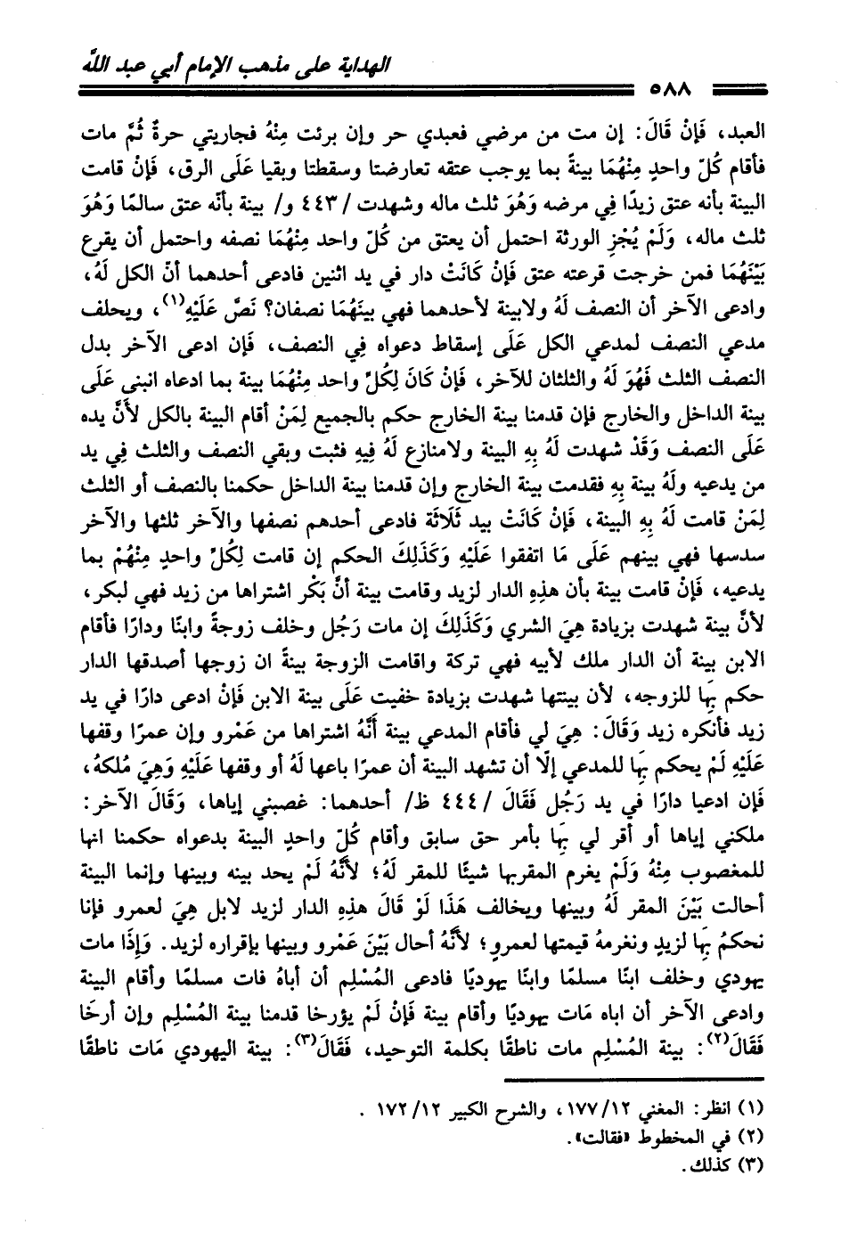 العبد، فَإنْ قَالَ: إن مت من مرضي فعبدي حر وإن برئت مِنْهُ فجاريتي حرةٌ ثُمَّ مات فأقام كُلّ واحدٍ مِنْهُمَا بينةً بما يوجب عتقه تعارضتا وسقطتا وبقيا عَلَى الرق، فَإنْ قامت البينة بأنه عتق زيداً فِي مرضه وَهُوَ ثلث ماله وشهدت /443 و/ بينة بأنّه عتق سالماً وَهُوَ ثلث ماله، وَلَمْ يُجْزِ الورثة احتمل أن يعتق من كُلّ واحد مِنْهُمَا نصفه واحتمل أن يقرع بَيْنَهُمَا فمن خرجت قرعته عتق فَإنْ كَانَتْ دار في يد اثنين فادعى أحدهما أنّ الكل لَهُ، وادعى الآخر أن النصف لَهُ ولابينة لأحدهما فهي بينَهُمَا نصفان؟ نَصَّ عَلَيْهِ (¬1)، ويحلف مدعي النصف لمدعي الكل عَلَى إسقاط دعواه فِي النصف، فَإنْ ادعى الآخر بدل النصف الثلث فَهُوَ لَهُ والثلثان للآخر، فَإنْ كَانَ لِكُلِّ واحد مِنْهُمَا بينة بما ادعاه انبنى عَلَى بينة الداخل والخارج فإن قدمنا بينة الخارج حكم بالجميع لِمَنْ أقام البينة بالكل لأَنَّ يده عَلَى النصف وَقَدْ شهدت لَهُ بِهِ البينة ولامنازع لَهُ فِيهِ فثبت وبقي النصف والثلث فِي يد من يدعيه ولَهُ بينة بِهِ فقدمت بينة الخارج وإن قدمنا بينة الداخل حكمنا بالنصف أو الثلث لِمَنْ قامت لَهُ بِهِ البينة، فَإنْ كَانَتْ بيد ثَلاَثَةَ فادعى أحدهم نصفها والآخر ثلثها والآخر سدسها فهي بينهم عَلَى مَا اتفقوا عَلَيْهِ وَكَذَلِكَ الحكم إن قامت لِكُلِّ واحدٍ مِنْهُمْ بما يدعيه، فَإنْ قامت بينة بأن هذِهِ الدار لزيد وقامت بينة أنَّ بَكْر اشتراها من زيد فهي لبكر، لأنَّ بينة شهدت بزيادة هِيَ الشري وَكَذَلِكَ إن مات رَجُل وخلف زوجةً وابناً وداراً فأقام الابن بينة أن الدار ملك لأبيه فهي تركة واقامت الزوجة بينةً ان زوجها أصدقها الدار حكم بِهَا للزوجه، لأن بينتها شهدت بزيادة خفيت عَلَى بينة الابن فَإنْ ادعى داراً في يد زيد فأنكره زيد وَقَالَ: هِيَ لي فأقام المدعي بينة أَنَّهُ اشتراها من عَمْرو وإن عمراً وقفها عَلَيْهِ لَمْ يحكم بِهَا للمدعي إلاّ أن تشهد البينة أن عمراً باعها لَهُ أو وقفها عَلَيْهِ وَهِيَ مُلكَهُ، فَإنْ ادعيا داراً في يد رَجُل فَقَالَ /444 ظ/ أحدهما: غصبني إياها، وَقَالَ الآخر: ملكني إياها أو أقر لي بِهَا بأمر حق سابق وأقام كُلّ واحدٍ البينة بدعواه حكمنا انها للمغصوب مِنْهُ وَلَمْ يغرم المقربها شيئاً للمقر لَهُ؛ لأَنَّهُ لَمْ يحد بينه وبينها وإنما البينة أحالت بَيْنَ المقر لَهُ وبينها ويخالف هَذَا لَوْ قَالَ هذِهِ الدار لزيد لابل هِيَ لعمرو فإنا نحكمُ بِهَا لزيدٍ ونغرمهُ قيمتها لعمروٍ؛ لأَنَّهُ أحال بَيْنَ عَمْرو وبينها بإقراره لزيد. وَإِذَا مات يهودي وخلف ابناً مسلماً وابناً يهودياً فادعى المُسْلِم أن أباهُ فات مسلماً وأقام البينة وادعى الآخر أن اباه مَات يهودياً وأقام بينة فَإنْ لَمْ يؤرخا قدمنا بينة المُسْلِم وإن أرخَا فَقَالَ (¬2): بينة المُسْلِم مات ناطقاً بكلمة التوحيد، فَقَالَ (¬3): بينة اليهودي مَات ناطقاً