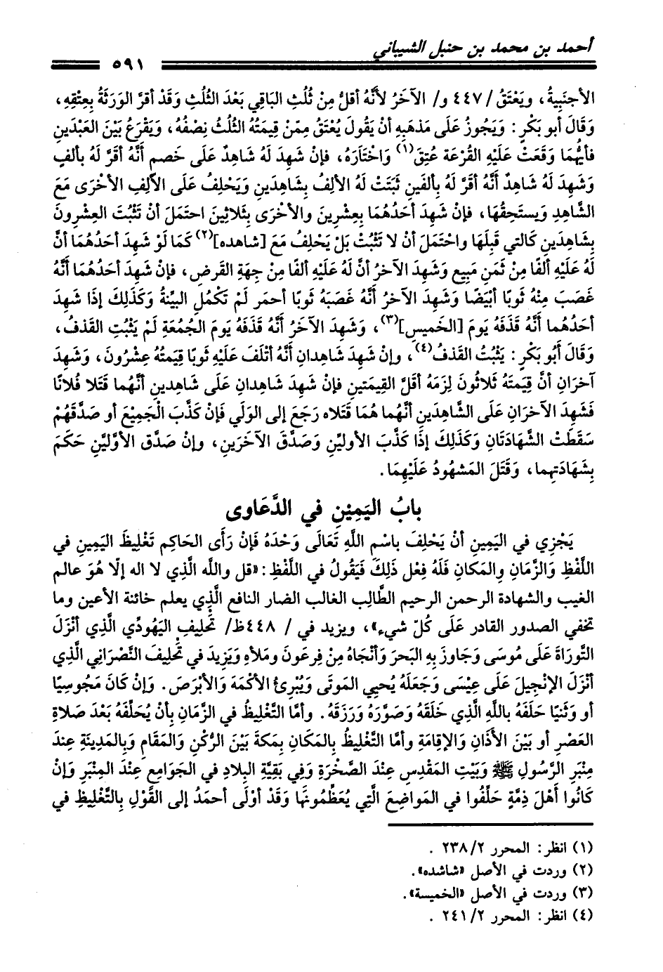 يَجْزِي في اليَمِينِ أنْ يَحْلِفَ باسْمِ اللهِ تَعَالَى وَحْدَهُ فَإنْ رَأَى الحَاكِم تَغْلِيظَ اليَمِينِ في اللَّفْظِ وَالزَّمَانِ وِالمَكانِ فَلَهُ فِعْل ذَلِكَ فَيَقُولُ في اللَّفْظِ: ((قل والله الَّذِي لا اله إلاّ هُوَ عالم الغيب والشهادة الرحمن الرحيم الطَّالِب الغالب الضار النافع الَّذِي يعلم خائنة الأعين وما تخفي الصدور القادر عَلَى كُلّ شيء))، ويزيد في / 448ظ/ تَحْلِيفِ اليَهُودِّي الَّذِي أنْزَلَ التَّورَاةَ عَلَى مُوسَى وَجَاوزَ بِهِ البَحرَ وَأنْجَاهُ مِنْ فِرعَونَ ومَلأهِ وَيَزِيدَ في تَحْلِيفَ النَّصْرَانِي الَّذِي أنْزَلَ الإنْجِيلَ عَلَى عِيْسَى وَجَعَلَهُ يُحيِي المَوتَى وَيُبْرِئُ الأكْمَهَ وَالأبْرَصَ. وَإنْ كَانَ مَجُوسِياً أو وَثَنياً حَلَفَهُ باللهِ الَّذِي خَلَقَهُ وَصَوَّرَهُ وَرَزَقَهُ. وأمَّا التَّغْلِيظُ في الزَّمَانِ بِأنْ يُحَلِّفَهُ بَعْدَ صَلاةِ العَصْرِ أو بَيْنَ الأَذَانِ وَالإقِامَةِ وأمَّا التَّغْلِيظُ بِالمَكَانِ بِمَكةَ بَيْنَ الرُّكْنِ وَالمَقَامِ وَبِالمَدِينَةِ عِندَ مِنْبَرِ الرَّسُولِ - صلى الله عليه وسلم - وَبَيْتِ المَقْدِسِ عِنْدَ الصَّخْرَةِ وَفِي بَقِيَّةِ البِلادِ في الجَوَامِعِ عِنْدَ المِنْبَرِ وَإنْ كَانُوا أَهْلَ ذِمَّةٍ حَلِّفُوا في المَواضِعَ الَّتِي يُعَظِّمُونَهَا وَقَدْ أوْلَى أحمَدُ إلى القَوْلِ بِالتَّغْلِيظِ في