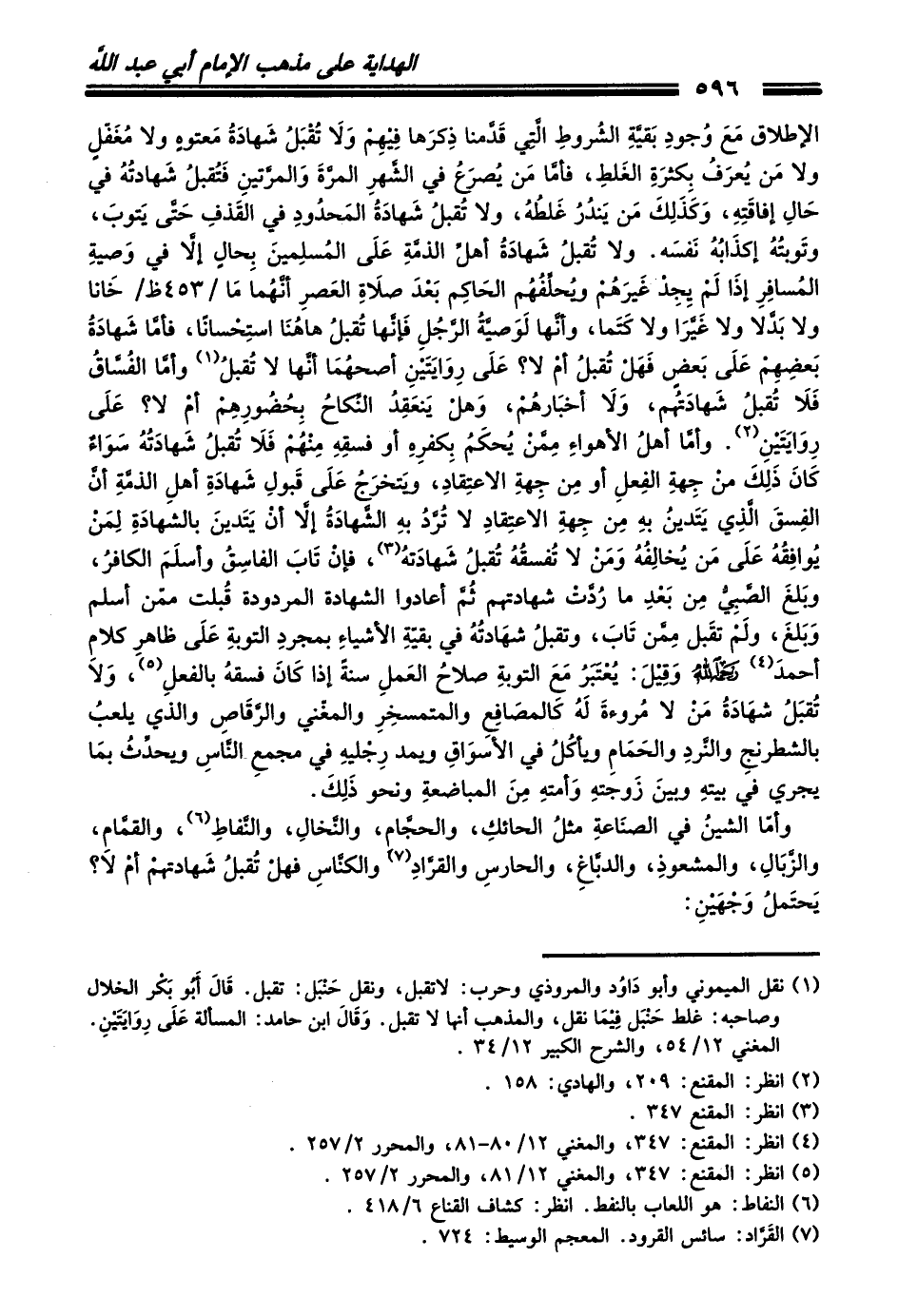 الإطلاق مَعَ وُجودِ بَقيَّةِ الشُروطِ الَّتِي قَدَّمنا ذِكرَها فِيْهِمْ وَلاَ تُقْبَلُ شَهادَةُ مَعتوهٍ ولا مُغَفّلٍ ولا مَن يُعرَفُ بِكثرَةِ الغَلطِ، فأمَّا مَن يُصرَعُ في الشَّهرِ المرَّةَ وَالمرَّتينِ فَتُقبلُ شَهادتُهُ في حَالِ إفاقَتِهِ، وَكَذَلِكَ مَن يَندُرُ غَلطُهُ، ولا تُقبلُ شَهادَةُ المَحدُودِ في القَذفِ حَتَّى يَتوبَ، وتَوبتُهُ إكذَابُهُ نَفسَه. ولا تُقبلُ شَهادَةُ أهلِّ الذمَّةِ عَلَى المُسلِمينَ بِحالٍ إلاَّ في وَصيةِ المُسافِرِ إذَا لَمْ يِجِدْ غَيرَهُمْ ويُحلِّفُهُم الحَاكِم بَعْدَ صلاَةِ العَصرِ أنَّهُما مَا /453ظ/ خَانا ولا بَدَّلا ولا غَيَّرَا ولا كَتَما، وأنَّها لَوَصيَّةُ الرَّجُلِ فَإنَّها تُقبلُ هاهُنَا استِحْساناً، فأمَّا شَهادَةُ بَعضِهِمْ عَلَى بَعضٍ فَهَلْ تُقبلُ أمْ لا؟ عَلَى رِوَايَتَيْنِ أصحهُمَا أنَّها لا تُقبلُ (¬1) وأمَّا الفُسَّاقُ فَلاَ تُقبلُ شَهادَتُهم، وَلاَ أخبَارَهُمْ، وَهلْ يَنعَقِدُ النِّكاحُ بِحُضُورِهِمْ أمْ لا؟ عَلَى رِوَايَتَيْنِ (¬2). وأمَّا أهلُ الأهواءِ مِمَّنْ يُحكَمُ بِكفرِهِ أو فُسقِهِ مِنْهُمْ فَلاَ تُقبلُ شَهادَتُهُ سَوَاءٌ كَانَ ذَلِكَ منْ جِهةِ الفِعلِ أو مِن جِهةِ الاعتِقادِ، ويَتخرَجُ عَلَى قَبولِ شَهادَةِ أهلِ الذمَّةِ أنَّ الفِسقَ الَّذِي يَتَدينُ بهِ مِن جِهةِ الاعتِقادِ لا تُرَّدُ بهِ الشَّهادَةُ إلاَّ أنْ يَتَدينَ بالشهادَةِ لِمَنْ يُوافِقُهُ عَلَى مَن يُخالِفُهُ وَمَنْ لا تُفسقُهُ تُقبلُ شَهادَتهُ (¬3)، فإنْ تَابَ الفاسِقُ وأسلَمَ الكافرُ، وبَلغَ الصَّبِيُّ مِن بَعْدِ ما رُدَّتْ شهادتهم ثُمَّ أعادوا الشهادة المردودة قُبلت ممّن أسلم وَبَلغَ، ولَمْ تقَبل مِمَّن تَابَ، وتقبلُ شهَادتُهُ في بقيّةِ الأشياءِ بمجردِ التوبةِ عَلَى ظاهرِ كلامِ أحمدَ (¬4) -رَحِمَهُ اللهُ - وَقِيْلَ: يُعْتَبَرُ مَعَ التوبةِ صلاحُ العَملِ سنةً إذا كَانَ فسقهُ بالفعلِ (¬5)، وَلا تُقبَلُ شهَادَةُ مَنْ لا مُروءةَ لَهُ كَالمصَافِعِ والمتمسخِرِ والمغّنَّي والرَّقَاصِ والذي يلعبُ بالشطرنجِ والنَّردِ والحَمَامِ ويأكُلُ في الأسوَاقِ ويمد رِجْليهِ في مجمعِ النَّاسِ ويحدِّثُ بمَا يجري في بيتهِ وبينَ زَوجتهِ وَأمتهِ مِنَ المباضَّعةِ ونحو ذَلِكَ.