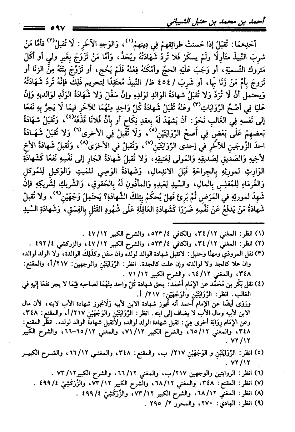 (¬4) نقل بَكْر بن مُحَمَّد عن الإِمَام أَحْمَد: يحق شهادة كُلّ واحد مِنْهُمَا لصاحبه فِيْمَا لا يجر نفعاً إِليهِ في الغالب. انظر: الرِّوَايَتَيْنِ والوَجْهَيْنِ: 217/ أ.