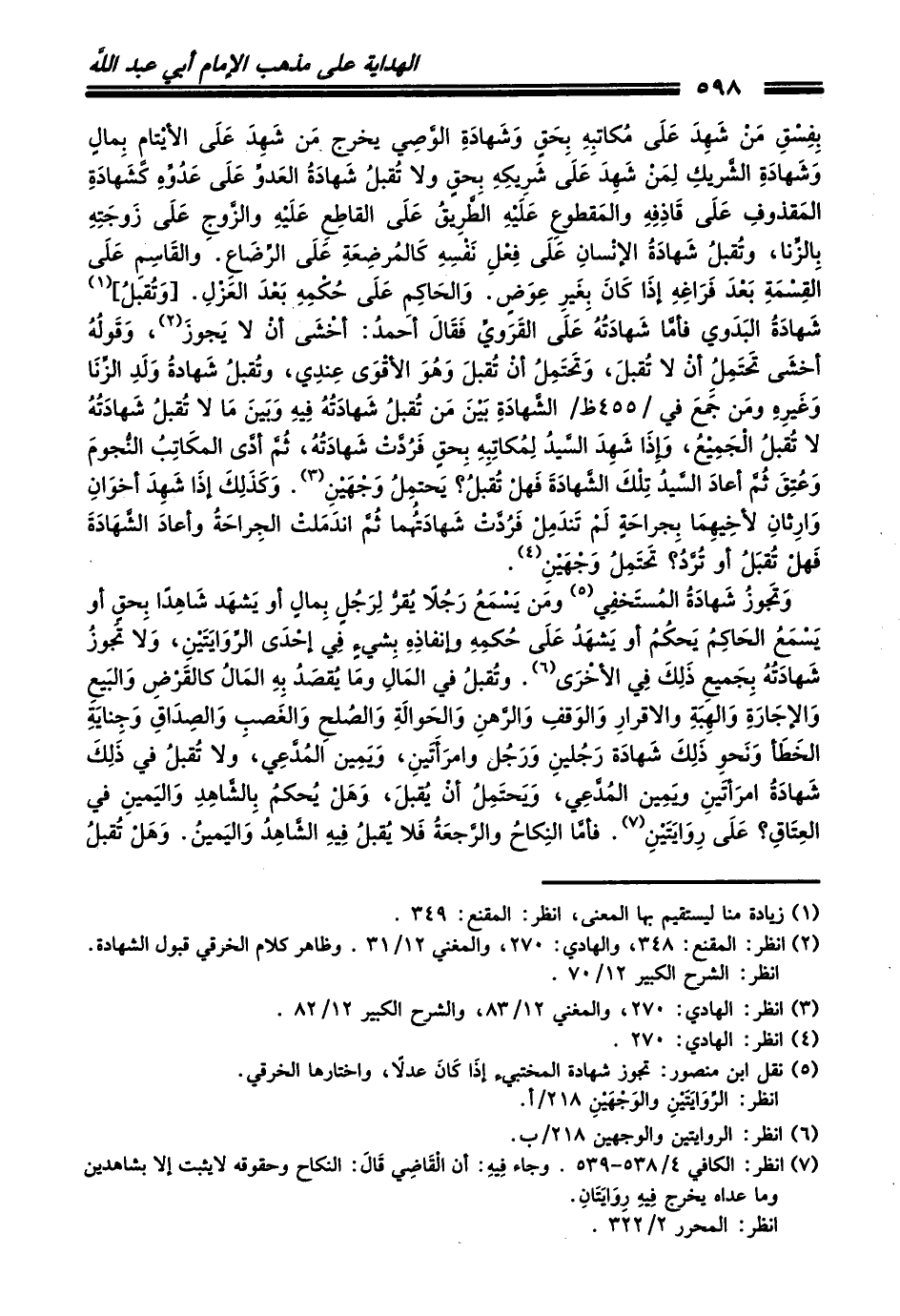 (¬7) انظر: الكافي 4/ 538 - 539. وجاء فِيهِ: أن الْقَاضِي قَالَ: النكاح وحقوقه لايثبت إلا بشاهدين وما عداه يخرج فِيهِ رِوَايَتَانِ.