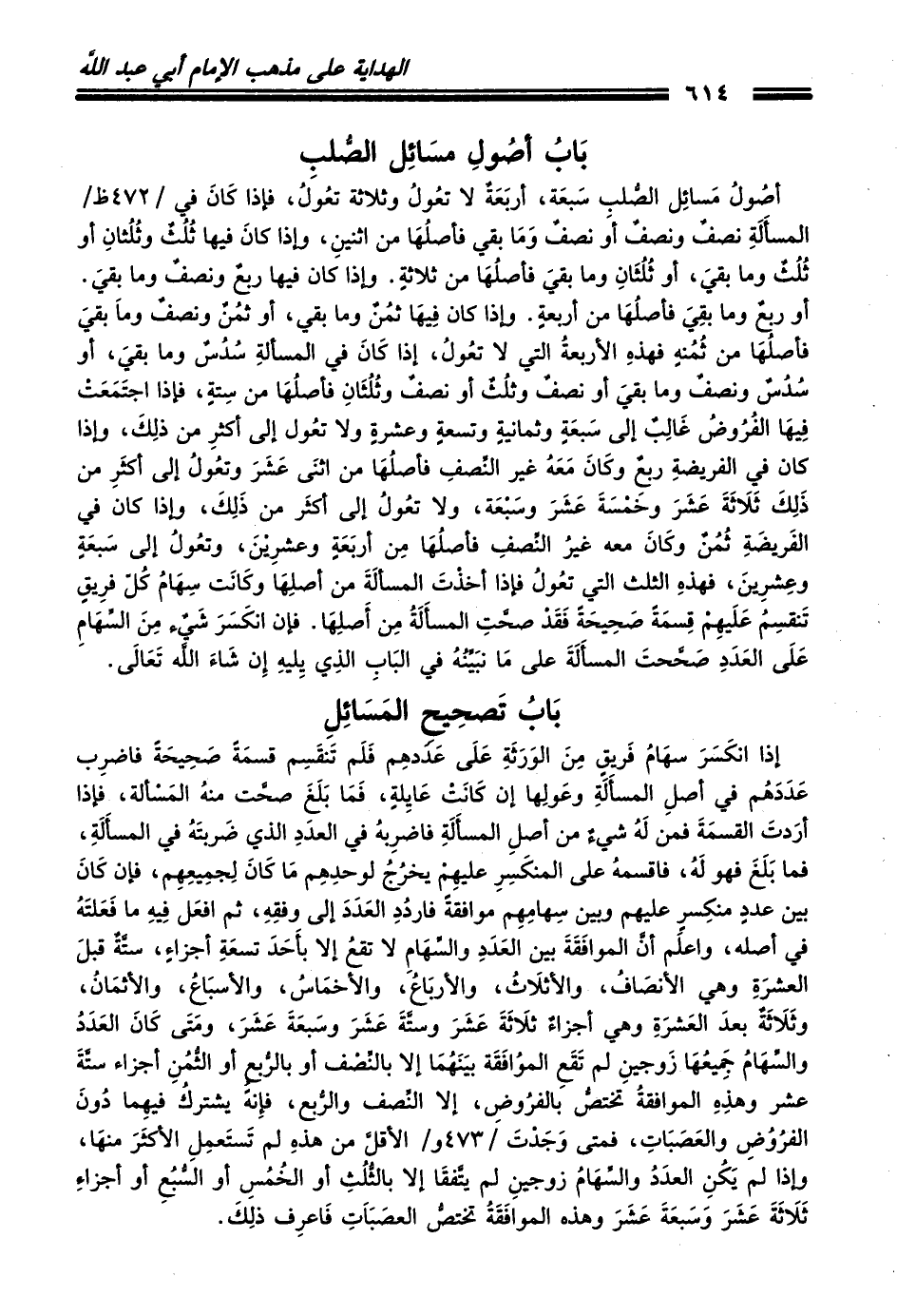 أصُولُ مَسائِل الصُّلبِ سَبعَة، أربَعَةٌ لا تعُولُ وثلاثة تعُولُ، فإذا كَانَ في /472ظ/ المسأَلَةِ نصفٌ ونصفٌ أو نصفٌ وَمَا بقي فأصلُهَا من اثنينِ، وإذا كانَ فيها ثُلُثٌ وثُلُثانِ أو ثُلُثٌ وما بقيَ، أو ثُلُثَانِ وما بقيَ فأصلُهَا من ثلاثةٍ. وإذا كان فيها ربعٌ ونصفٌ وما بقيَ. أو ربعٌ وما بقِيَ فأصلُهَا من أربعةٍ. وإذا كان فِيهَا ثمُنٌ وما بقي، أو ثمُنٌ ونصفٌ وماَ بقيَ فأصلُهَا من ثُمُنهٍ فهذهِ الأربعةُ التي لا تعُولُ، إذا كَانَ في المسألةِ سُدُسٌ وما بقيَ، أو سُدُسٌ ونصفٌ وما بقيَ أو نصفٌ وثلُثٌ أو نصفٌ وثُلُثَانِ فأصلُهَا من سِتةٍ، فإذا اجتَمَعَتْ فِيهَا الفُرُوضُ غَالِبٌ إلى سَبعَةٍ وثمانيةٍ وتسعةٍ وعشرةٍ ولا تعُول إلى أكثرِ من ذلِكَ، وإذا كان في الفريضةِ ربعٌ وكَانَ مَعَهُ غيُر النِّصفِ فأصلُهَا من اثنَى عَشَرَ وتعُولُ إلى أكثَرِ من ذَلِكَ ثَلاَثَةَ عَشَرَ وخَمْسَةَ عَشَرَ وسَبْعَةَ، ولا تعُولُ إلى أكثَرِ من ذَلِكَ، وإذا كان في الفَريضَةِ ثُمُنٌ وكَانَ معه غيرُ النِّصفِ فأصلُهَا مِن أربَعَةٍ وعشرِيْنَ، وتعُولُ إلى سَبعَةٍ وعِشرِينَ، فهذهِ الثلث التي تعُولُ فإذا أخذْتَ المسألَةَ من أصلِهَا وكَانَت سِهَامُ كُلَّ فرِيقٍ تَنقسِمُ عَلَيهِمْ قِسمَةً صَحِيحَةً فَقَدْ صحَّتِ المسأَلَةُ مِن أَصلِهَا. فإن انكَسَرَ شَيٌء مِنَ السِّهَامِ عَلَى العَدَدِ صَحَّحتَ المسأَلَةَ على مَا نبَيِّنُهُ في البَابِ الذِي يِليهِ إِن شَاءَ الله تَعَالَى.