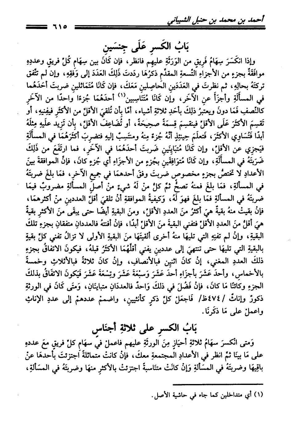 وَمتى انْكسرَ سهَامُ ثلاثةِ أحيَازٍ مِنَ الورثَةِ عليهم فاعملْ في سهَامِ كلِّ فريقٍ معَ عددهِ على مَا بينَا ثمَّ انظر في الأعدادِ المجتمعةِ معكَ، فإنْ كانتْ متماثلةً اجتزئتَ بأحدهَا عنْ باقِيهَا وضربتَهُ في المسَألةِ وَإنْ كانَتْ متنَاسبةً اجتزئتْ بالأكثرِ منهَا وضربتَهُ في ... المسَألةِ،