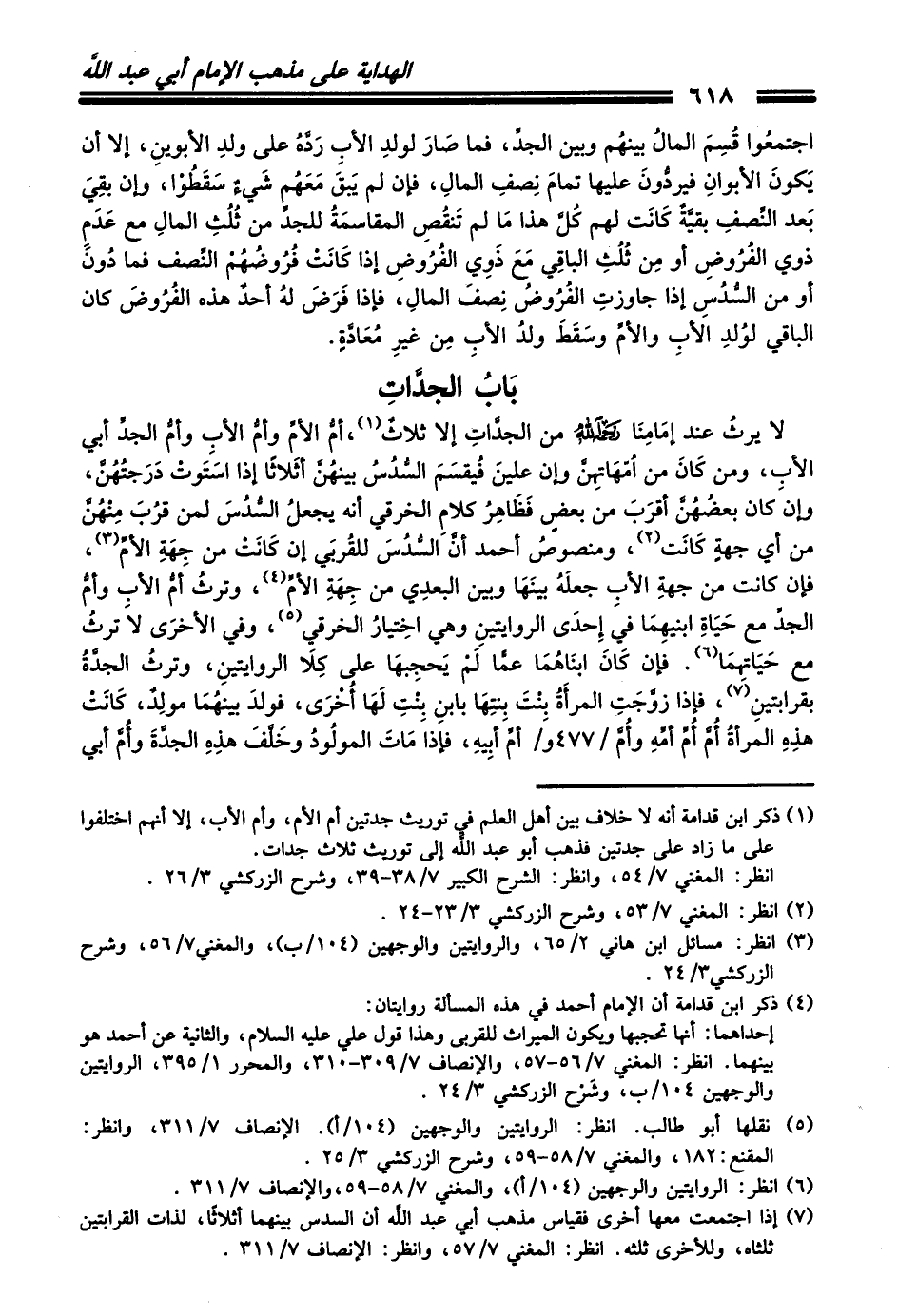 (¬1) ذكر ابن قدامة أنه لا خلاف بين أهل العلم في توريث جدتين أم الأم، وأم الأب، إلا أنهم اختلفوا على ما زاد على جدتين فذهب أبو عبد الله إلى توريث ثلاث جدات.