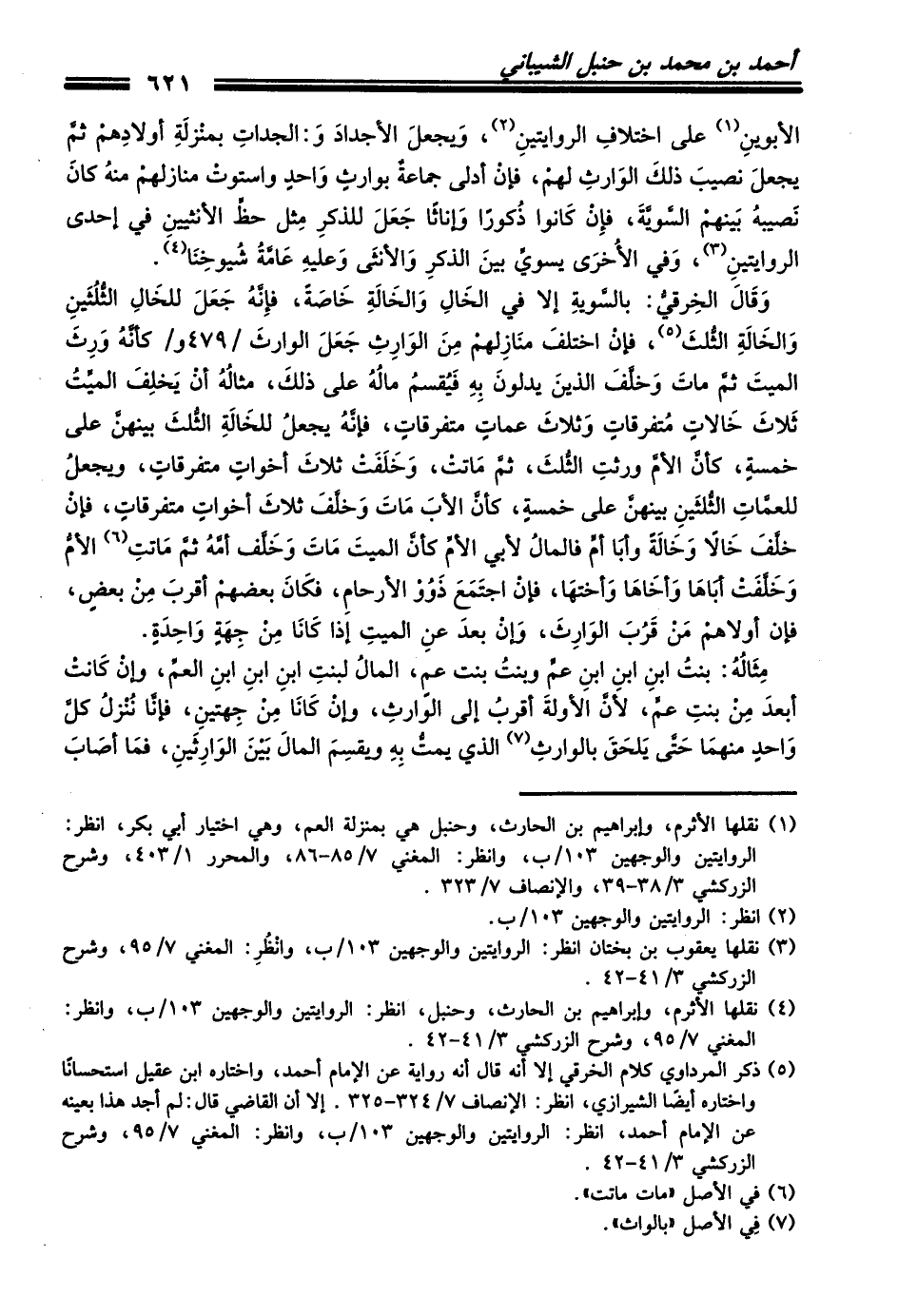 الأبوينِ (¬1) على اختلافِ الروايتينِ (¬2)، وَيجعلَ الأجدادَ وَالجداتِ بمنْزلَةِ أولادِهمْ ثمَّ يجعلَ نصيبَ ذلكَ الوَارثِ لهمْ، فإنْ أدلى جماعةٌ بوارثٍ وَاحدٍ واستوتْ منازلهمْ منهُ كانَ نَصيبهُ بَينهمْ السَّويَّةَ، فإِنْ كَانوا ذُكوراً وَإناثَاً جَعَلَ للذكرِ مِثل حظِّ الأنثيينِ في إحدى الروايتينِ (¬3)، وَفي الأُخرَى يسويِّ بينَ الذكرِ وَالأنثَى وَعليهِ عَامَّةُ شُيوخِنَا (¬4).
