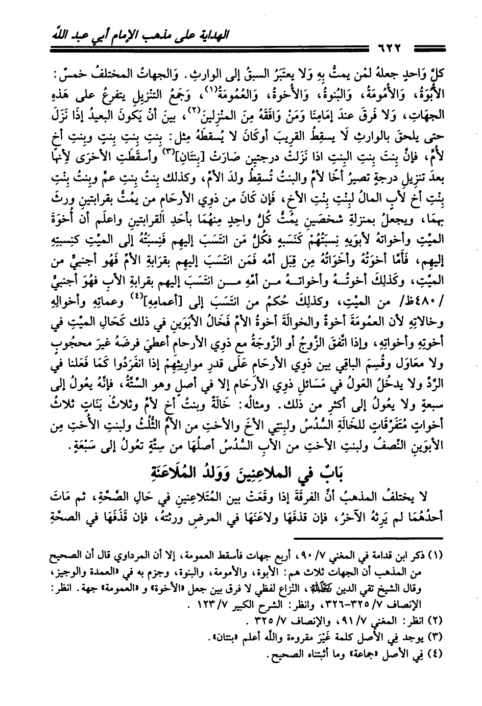(¬1) ذكر ابن قدامة في المغني 7/ 90، أربع جهات فأسقط العمومة، إلا أن المرداوي قال أن الصحيح من المذهب أن الجهات ثلاث هم: الأبوة، والأمومة، والبنوة، وجزم به في "العمدة والوجيز، وقال الشيخ تقي الدين رحمه الله، النْزاع لفظي لا فرق بين جعل ((الأخوة)) و ((العمومة)) جهة. انظر: الإنصاف 7/ 325 - 326، وانظر: الشرح الكبير 7/ 123.