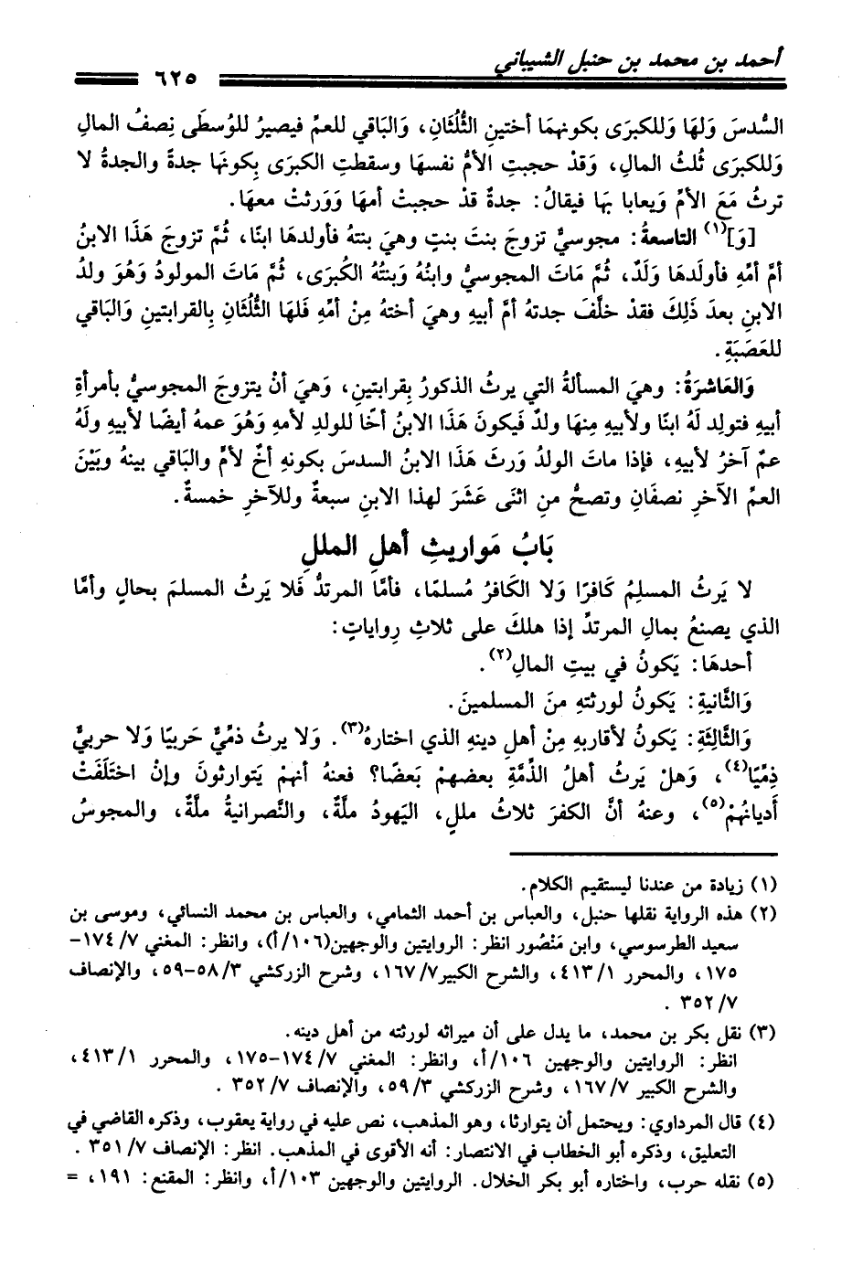 لا يَرثُ المسلِمُ كَافراً وَلا الكَافرُ مُسلمَاً، فأمَّا المرتدُّ فَلا يَرثُ المسلمَ بحالٍ وأمَّا الذي يصنعُ بمالِ المرتدِّ إذا هلكَ على ثلاثِ رِواياتٍ: