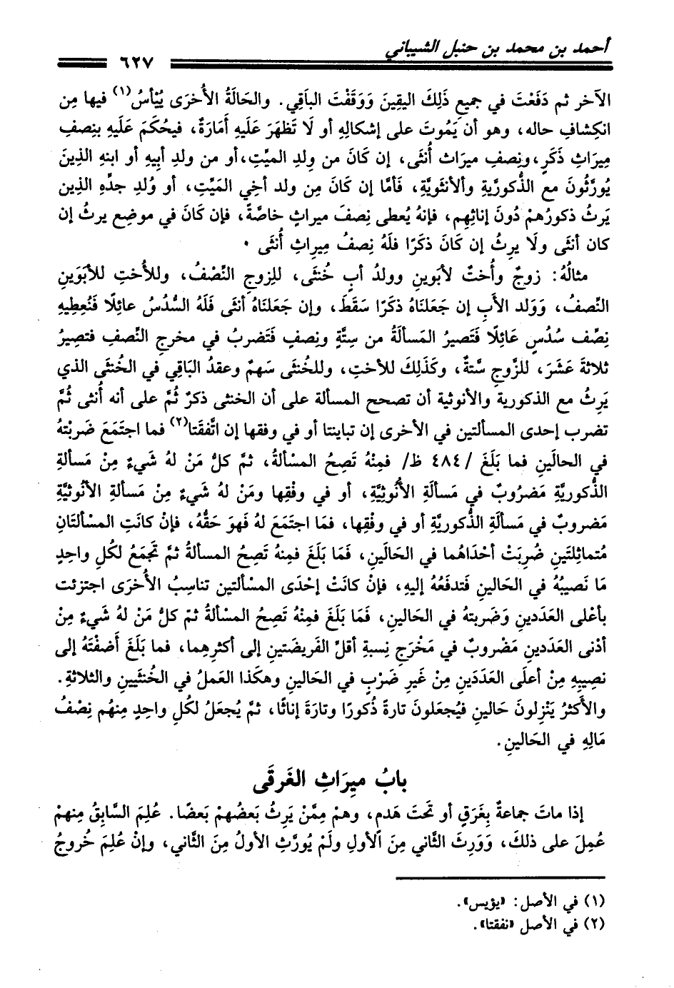 مثالُهُ: زوجٌ وأُختٌ لأبَوينِ وولدُ أبٍ خُنثَى، للِزوجِ النِّصْفُ، وللأُختِ للأبَوَينِ النِّصفُ، وَوَلد الأَبِ إن جَعَلنَاهُ ذكَرَاً سَقَطَ، وإن جَعَلنَاهُ أنثَى فَلَهُ السُّدُسُ عائِلاًَ فَنُعِطِيهِ نِصِّف سُدُسٍ عَائِلاً فَتَصيرُ المَسألَةُ من سِتَّةٍ ونِصفٍ فَتَضربُ في مخرجِ النِّصفِ فتصِيرُ ثلاثةَ عَشَرَ، للزَّوجِ سَّتةٌ، وكَذَلِكَ للأختِ، وللخُنثَى سَهمٌ وعقدُ البَاقِي في الخُنثَى الذي يَرِثُ مع الذكورية والأنوثية أن تصحح المسألة على أن الخنثى ذكرٌ ثُمَّ على أنه أُنثى ثُمَّ تضرب إحدى المسألتين في الأخرى إن تباينتا أو في وفقها إن اتَّفقَتا (¬2) فما اجتَمَعَ ضَربْتهُ في الحالَينِ فما بَلَغَ /484 ظ/ فمِنْهُ تَصِحُ المسْألةُ، ثمَّ كلُّ مَنْ لهُ شَيءٌ مِنْ مَسألةِ الذُّكوريَّةِ مَضرُوبٌ في مَسألَةِ الأُنُوثِيَّةِ، أو في وفْقِها ومَنْ لهُ شَيءٌ مِنْ مَسألةِ الأنُوثيَّةِ مَضروبٌ في مَسألَةِ الذُّكوريَّةِ أو في وفْقِها، فمَا اجتَمَعَ لهُ فَهوَ حَقُّهُ، فإنْ كانَتِ المسْألتَانِ مُتماثِلتَينِ ضُرِبَتْ أحْدَاهُما في الحَالَينِ، فَمَا بَلَغَ فمِنهُ تَصِحُ المسألةُ ثمَّ تَجمَعُ لكُلِ واحِدٍ مَا نَصيبُهُ في الحَالينِ فَتدفَعُهُ إليهِ، فإنْ كانَتْ إحْدَى المسْألتين تناسِبُ الأُخرَى اجتُزِئَتْ بأعْلى العَدَدينِ وَضَربَتْهُ في الحَالينِ، فَمَا بَلَغَ فمِنْهُ تَصِحُ المسْألةُ ثمّ كلُّ مَنْ لهُ شَيءٌ مِنْ أدْنى العَدَدينِ مَضْروبٌ في مَخْرَجِ نِسبةِ أقلِّ الفَريضَتينِ إلى أكثرِهِما، فما بَلَغَ أَضفْتَهُ إلى نصِيبِهِ مِنْ أعلَى العَدَدَينِ مِنْ غَيرِ ضَرْبٍ في الحَالينِ وهكَذا العَملُ في الخُنثَيينِ والثلاثةِ. والأَكثرُ يَنْزِلونَ حَالينِ فيُجعَلونَ تارةً ذُكورَاً وتارَةَ إناثَاً، ثمَّ يُجعَلُ لكُلِ واحِدٍ مِنهُم نِصْفُ مَالِهِ في الحَالينِ.