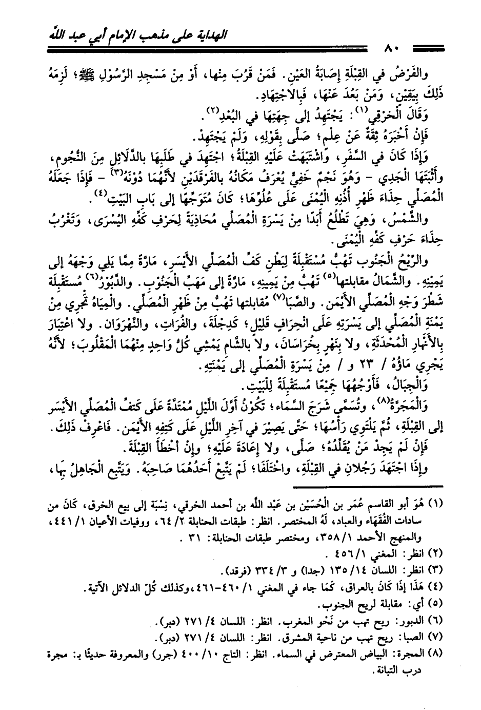والرِّيْحُ الْجَنُوب تَهُبُّ مُسْتَقْبِلَةً لِبَطْنِ كَفِّ الْمُصَلِّي الأَيْسَرِ، مَارَّةً مِمَّا يَلِي وَجْهَهُ إلى يَمِيْنِهِ. والشَّمَالُ مقابلتها (¬5) تَهُبُّ مِنْ يَمِينِهِ، مَارَّةً إلى مَهَبِّ الْجَنُوْبِ. والدَّبُوْرُ (¬6) مُستَقْبِلَة شَطْرَ وَجْهِ الْمُصَلِّي الأَيْمَن. والصَّبَا (¬7) مُقابلتها تَهُبُّ مِنْ ظَهْرِ الْمُصَلِّي. والْمِيَاهُ تَجْرِي مِنْ يَمْنَةِ الْمُصَلِّي إلى يَسْرَتِهِ عَلَى انْحِرَافٍ قَلِيْلٍ؛ كَدِجْلَةَ، والفُرَاتِ، والنَّهْرَوَان. ولا اعْتِبَارَ بِالأَنْهَارِ الْمُحْدَثَةِ، ولا بِنَهْرٍ بِخُرَاسَانَ، ولا بالشَّامِ يَمْشِي كُلُّ وَاحِدٍ مِنْهُمَا الْمَقْلُوبَ؛ لأَنَّهُ يَجْرِي مَاؤُهُ / 23 و / مِنْ يَسْرَةِ الْمُصَلِّي إلى يَمْنَتِهِ.