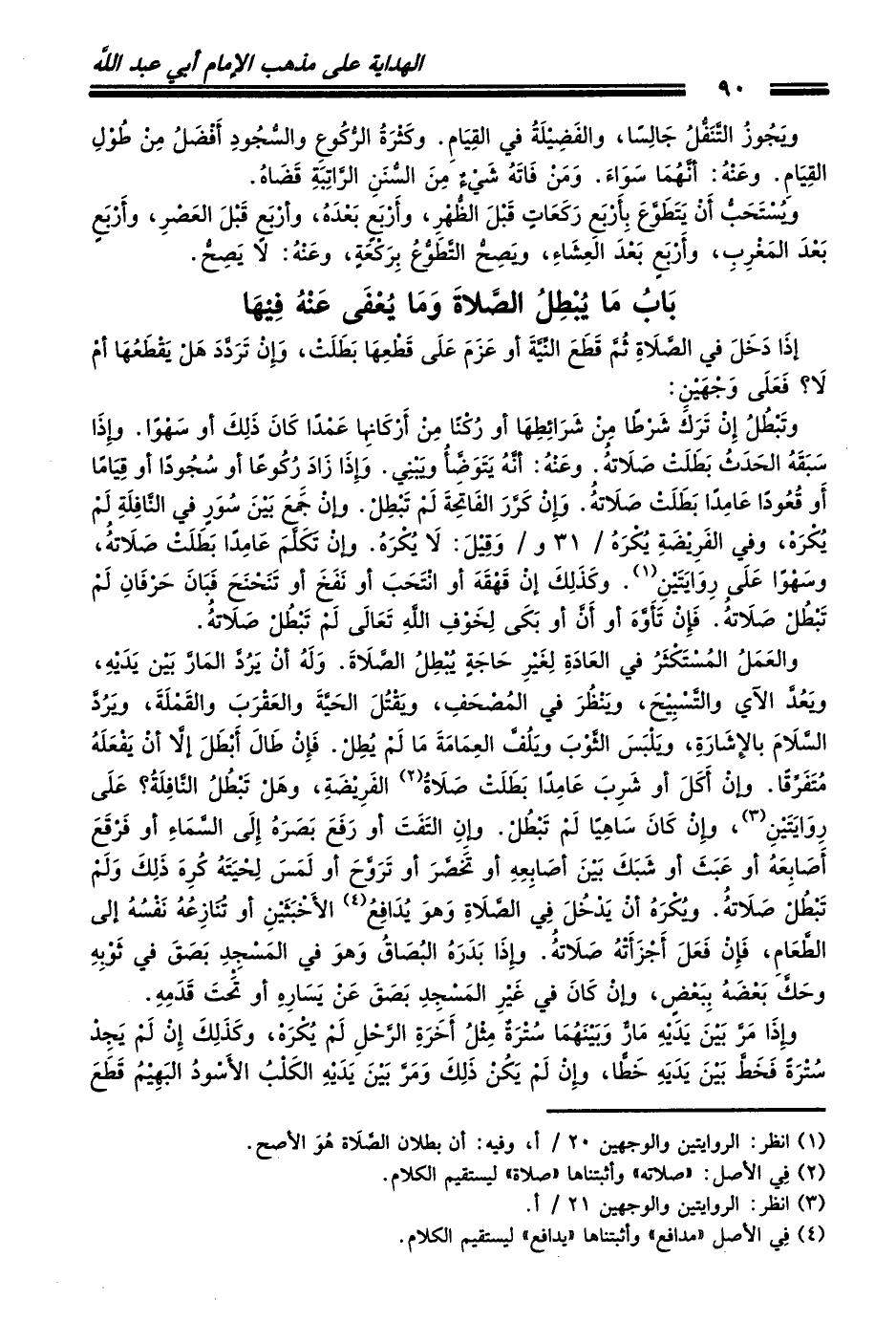 وتَبْطُلُ إِنْ تَرَكَ شَرْطاً مِنْ شَرَائِطِهَا أو رُكْناً مِنْ أَرْكَانِهِا عَمْداً كَانَ ذَلِكَ أو سَهْواً. وإِذَا سَبَقَهُ الحَدَثُ بَطَلَتْ صَلاَتُهُ. وعَنْهُ: أنَّهُ يَتَوَضَّأُ ويَبْنِي. وَإِذَا زَادَ رُكُوعاً أو سُجُوداً أو قِيَاماً أَو قُعُوداً عَامِداً بَطَلَتْ صَلاَتُهُ. وَإِنْ كَرَّرَ الفَاتِحَةَ لَمْ تَبْطِلْ. وإنْ جَمَعَ بَيْنَ سُوَرٍ في النَّافِلَةِ لَمْ يُكْرَهْ، وفي الفَرِيْضَةِ يُكْرَهُ / 31 و / وَقِيْلَ: لاَ يُكْرَهُ. وإنْ تَكَلَّمَ عَامِداً بَطَلَتْ صَلاَتُهُ، وسَهْواً عَلَى رِوَايَتَيْنِ (¬1). وكَذَلِكَ إنْ قَهْقَهَ أو انْتَحَبَ أو نَفَخَ أو تَنَحْنَحَ فَبَانَ حَرْفَانِ لَمْ تَبْطُلْ صَلاَتُهُ. فَإِنْ تَأَوَّهَ أو أَنَّ أو بَكَى لِخَوْفِ اللهِ تَعَالَى لَمْ تَبْطُلْ صَلاَتُهُ.
