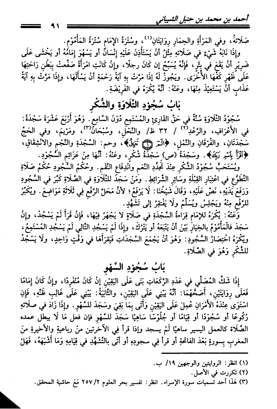 ويُسْتَحَبُّ سُجُوْدُ الشُّكْرِ عِنْدَ تَجَدُّدِ النِّعَمِ وانْدِفَاعِ النِّقَمِ. وحُكْمُ السُّجُودِ حُكْمُ صَلاَةِ التَّطَوُّعِ في اعْتِبَارِ القِبْلَةِ وسَائِرِ الشَّرَائِطِ. ومَنْ سَجَدَ للتِّلاَوَةِ في الصَّلاَةِ كَبَّرَ في السُّجُودِ وَرَفَعَ يَدَيْهِ، نَصَّ عَلَيْهِ، وَقَالَ شَيْخُنَا: لاَ يَرْفَعُ؛ لأنَّ مَحَلَّ الرَّفْعِ فِي ثَلاَثَةِ مَوَاضِعَ. ويُكَبِّرُ للرَّفْعِ مِنْهُ ويَجْلِسُ ويُسَلِّمُ ولاَ يَفْتقِرُ إلى تَشَهُّدٍ.