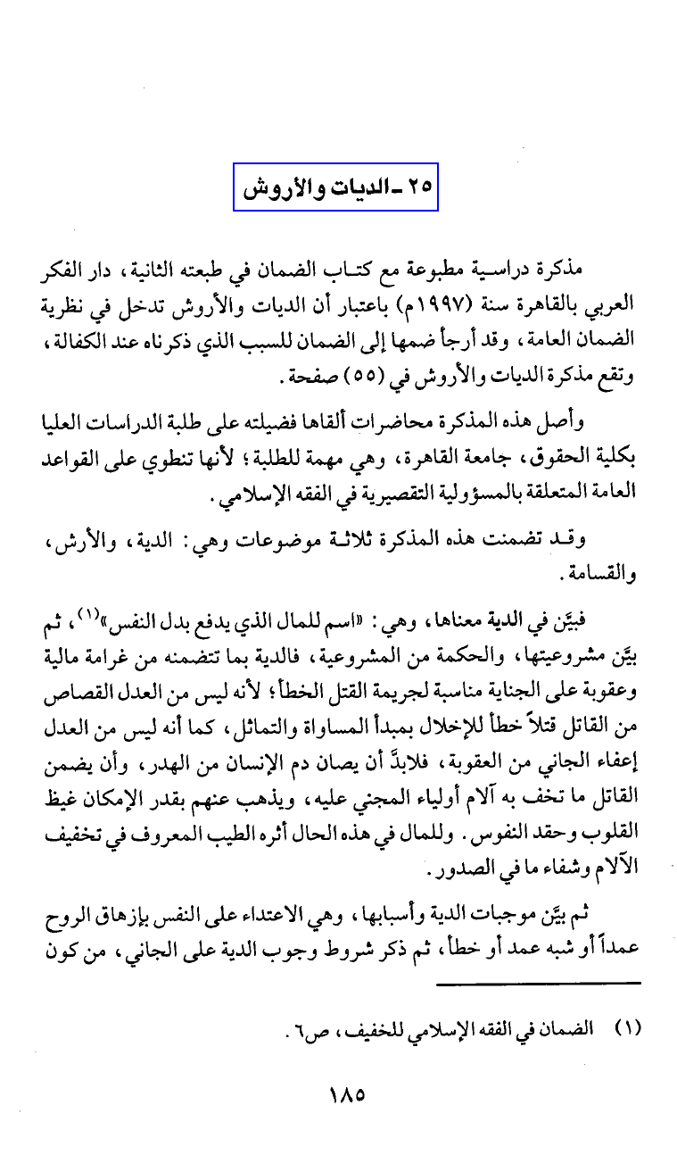 العربي بالقاهرة سنة (997 ام) باعتبار ان الديات والأروش تدخل في نظرية