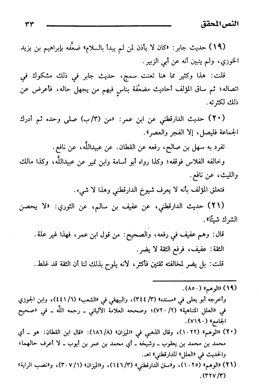 (19) حَدِيث جَابر: " كَانَ لَا يَأْذَن لمن لم يبْدَأ بِالسَّلَامِ " ضعفه بإبراهيم بن يزِيد
