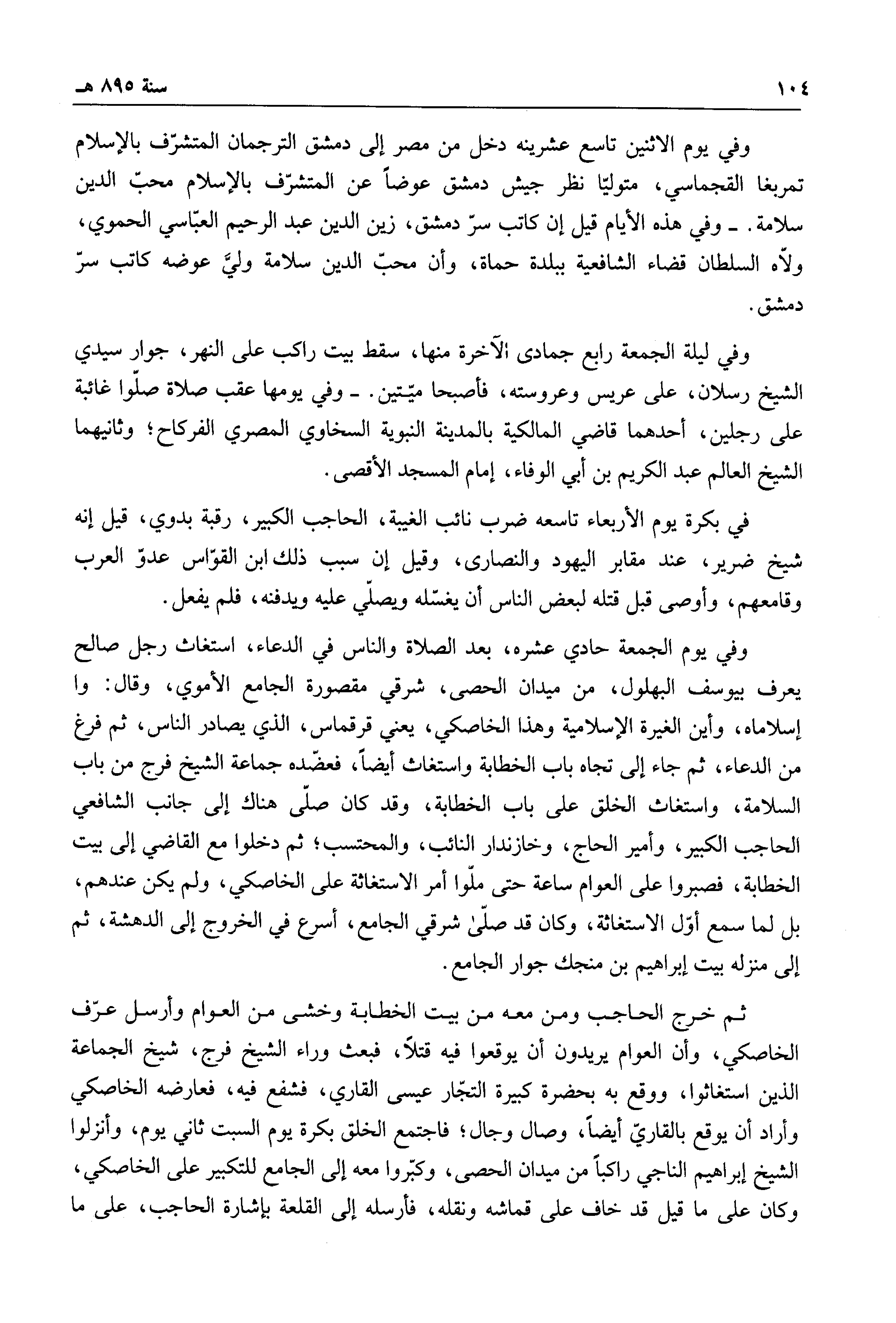 وفي يوم الجمعة حادي عشره، بعد الصلاة والناس في الدعاء، استغاث رجل صالح يعرف بيوسف البهلول، من ميدان الحصى، شرقي مقصورة الجامع الأموي، وقال: وا إسلاماه، وأين الغيرة الإسلامية وهذا الخاصكي، يعني قرقماس، الذي يصادر الناس، ثم فرغ من الدعاء، ثم جاء إلى تجاه باب الخطابة واستغاث أيضاً، فعضّده جماعة الشيخ فرج من باب السلامة، واستغاث الخلق على باب الخطابة، وقد كان صلّى هناك إلى جانب الشافعي الحاجب الكبير، وأمير الحاج، وخازندار النائب، والمحتسب؛ ثم دخلوا مع القاضي إلى بيت الخطابة، فصبروا على العوام ساعة حتى ملوا أمر الاستغاثة على الخاصكي، ولم يكن عندهم، بل لما سمع أوّل الاستغاثة، وكان قد صلّى شرقي الجامع، أسرع في الخروج إلى الدهشة، ثم إلى منزله بيت إبراهيم بن منجك جوار الجامع.