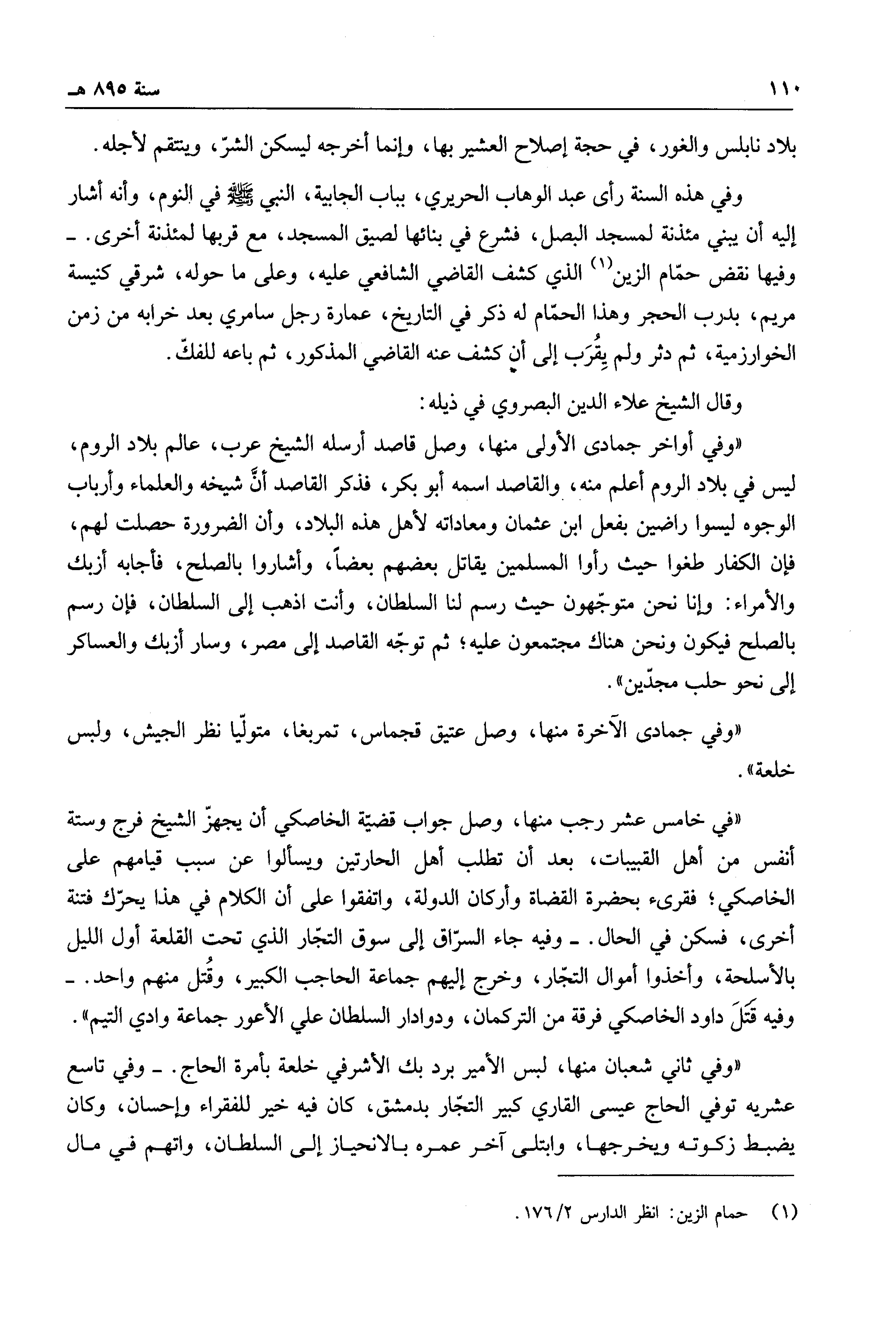 وفي هذه السنة رأى عبد الوهاب الحريري، بباب الجابية، النبي صلى الله عليه وسلم في النوم، وأنه أشار إليه أن يبنى مئذنة لمسجد البصل، فشرع في بنائها لصيق المسجد، مع قربها لمئذنة أخرى. وفها نقض حمام الزين الذي كشف القاضي الشافعي عليه، وعلى ما حوله، شرقي كنيسة مريم، بدرب الحجر وهذا الحمام له ذكر في التاريخ، عمارة رجل سامري بعد خرابه من زمن الخوارزمية، ثم دثر ولم يقرب إلى أن كشف عنه القاضي المذكور، ثم باعه للفلك.