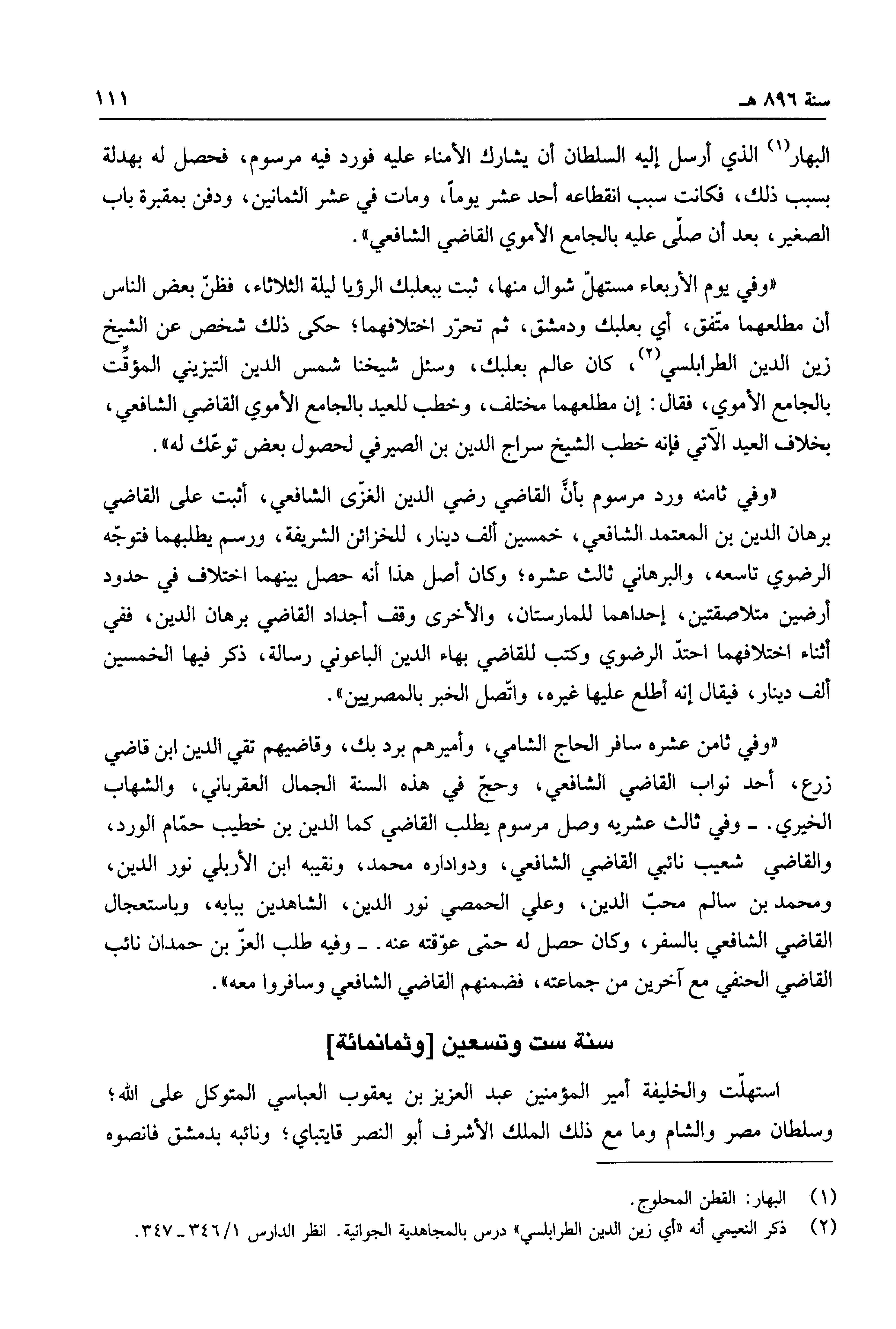استهلت والخليفة أمير المؤمنين عبد العزيز بن يعقوب العباسي المتوكل على الله؛ وسلطان مصر والشام وما مع ذلك الملك الأشرف أبو النصر قايتباي؛ ونائبه بدمشق قانصوه