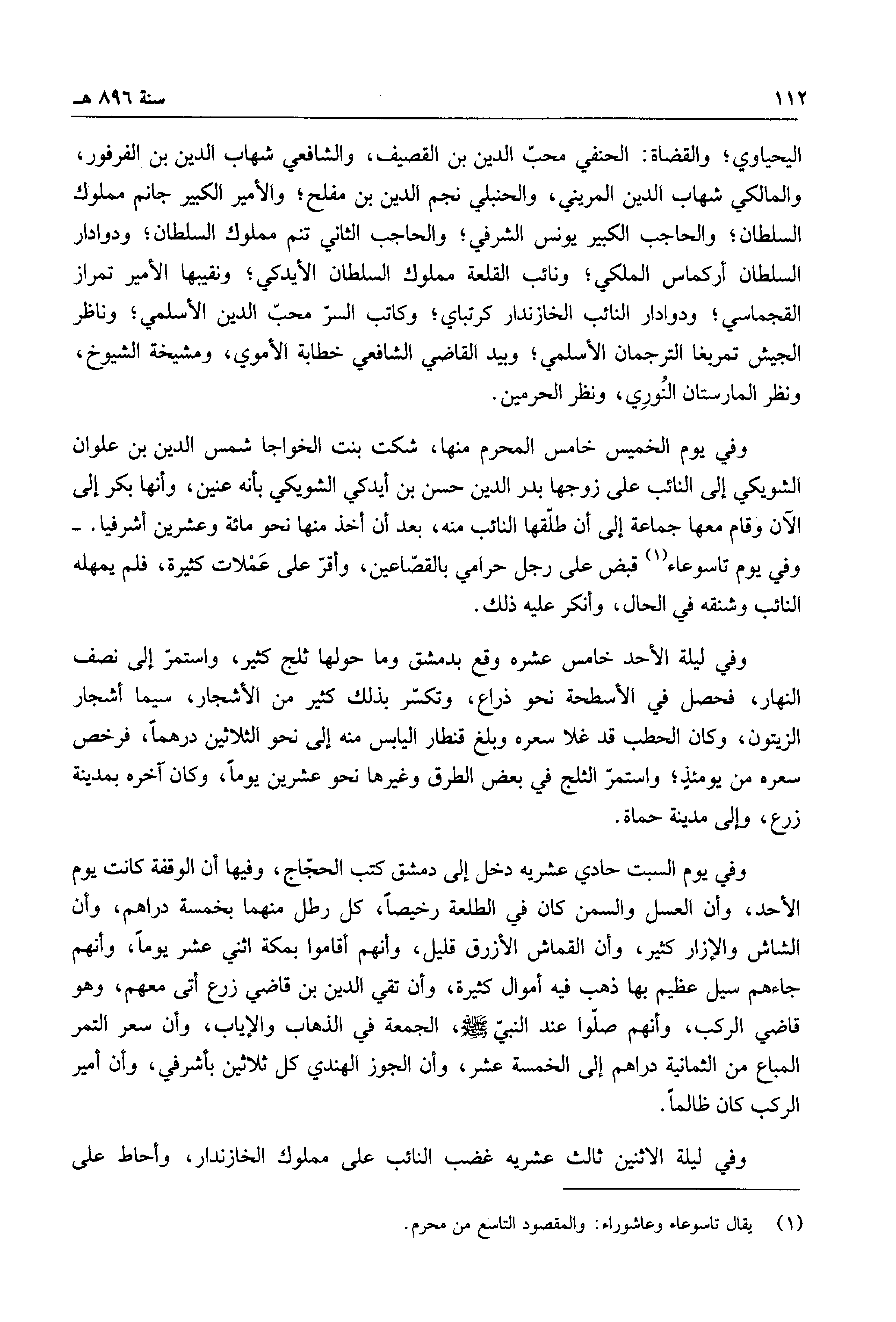 وفي يوم السبت حادي عشريه دخل إلى دمشق كتب الحجاج، وفيها أن الوقفة كانت يوم الأحد، وأن العسل والسمن كان في الطلعة رخيصاً، كل رطل منهما بخمسة دراهم، وأن الشاش والإزار كثير، وأن القماش الأزرق قليل، وأنهم أقاموا بمكة اثني عشر يوماً، وأنهم جاءهم سيل عظيم بها ذهب فيه أموال كثيرة، وأن تقي الدين بن قاضي زرع أتى معهم، وهو قاضي الركب، وأنهم صلوا عند النبي صلى الله عليه وسلم، الجمعة في الذهاب والإياب، وأن سعر التمر المباع من الثمانية دراهم إلى الخمسة عشر، وأن الجوز الهندي كل ثلاثين بأشرفي، وأن أمير الركب كان ظالماً.