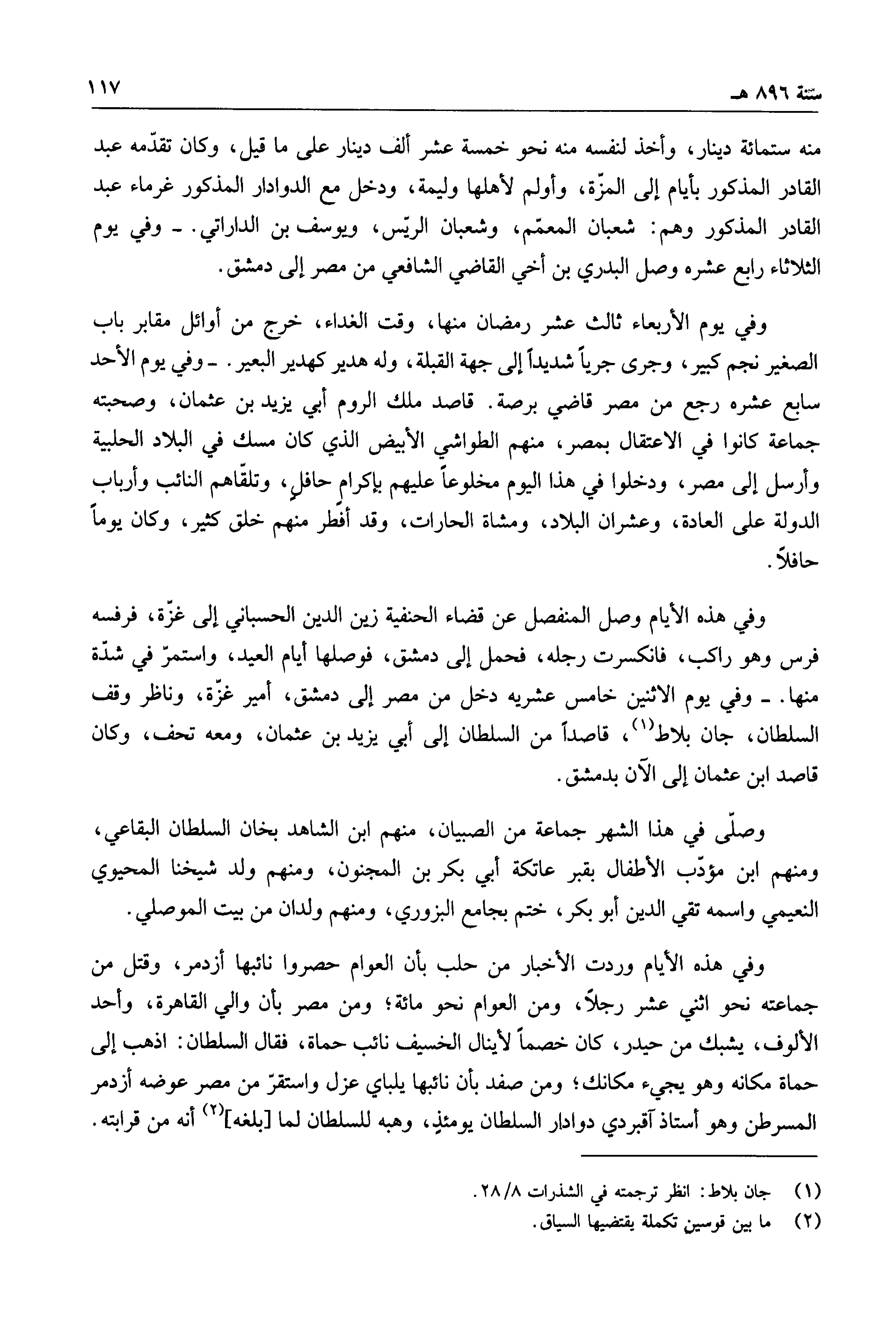 وفي هذه الأيام وصل المنفصل عن قضاء الحنفية زين الدين الحسباني إلى غزة، فرفسه فرس وهو راكب، فانكسرت رجله، فحمل إلى دمشق، فوصلها أيام العيد، واستمر في شدة منها. وفي يوم الاثنين خامس عشريه دخل من مصر إلى دمشق، أمير غزة، وناظر وقف السلطان، جان بلاط، قاصداً من السلطان إلى أبي يزيد بن عثمان، ومعه تحف، وكان قاصد ابن عثمان إلى الآن بدمشق.