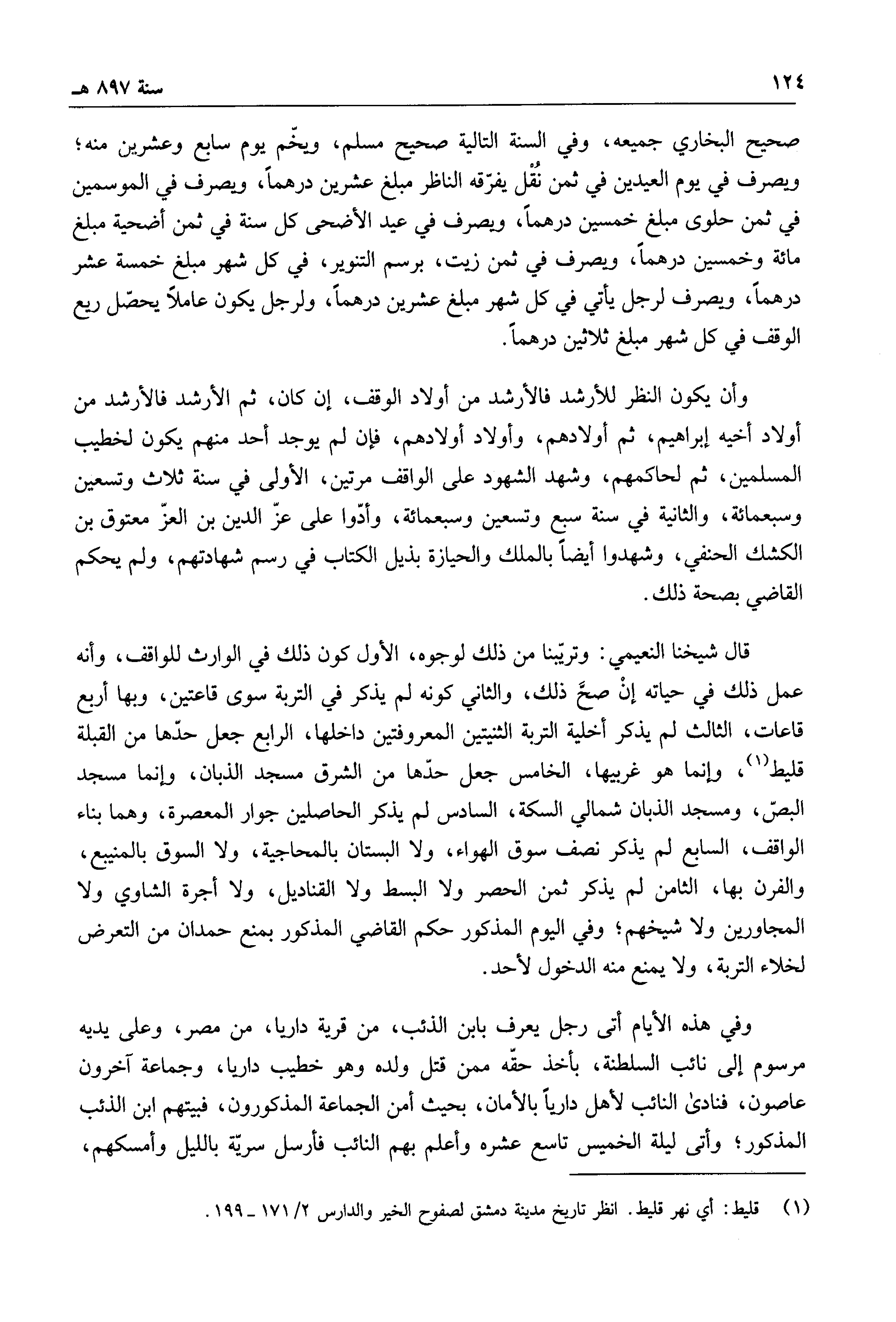 وأن يكن النظر للأرشد فالأرشد من أولاد الوقف، إن كان، ثم الأرشد فالأرشد من أولاد أخيه إبراهيم، ثم أولادهم، وأولاد أولادهم، فإن لم يوجد أحد منهم يكون لخطيب المسلمين، ثم لحاكمهم، وشهد الشهود على الواقف مرتين، الأولى في سنة ثلاث وتسعين وسبعمائة، والثانية في سنة سبع وتسعين وسبعمائة، وأدوا على عز الدين بن العز معتوق بن الكشك الحنفي، وشهدوا أيضاً بالملك والحيازة بذيل الكتاب في رسم شهادتهم، ولم يحكم القاضي بصحة ذلك.