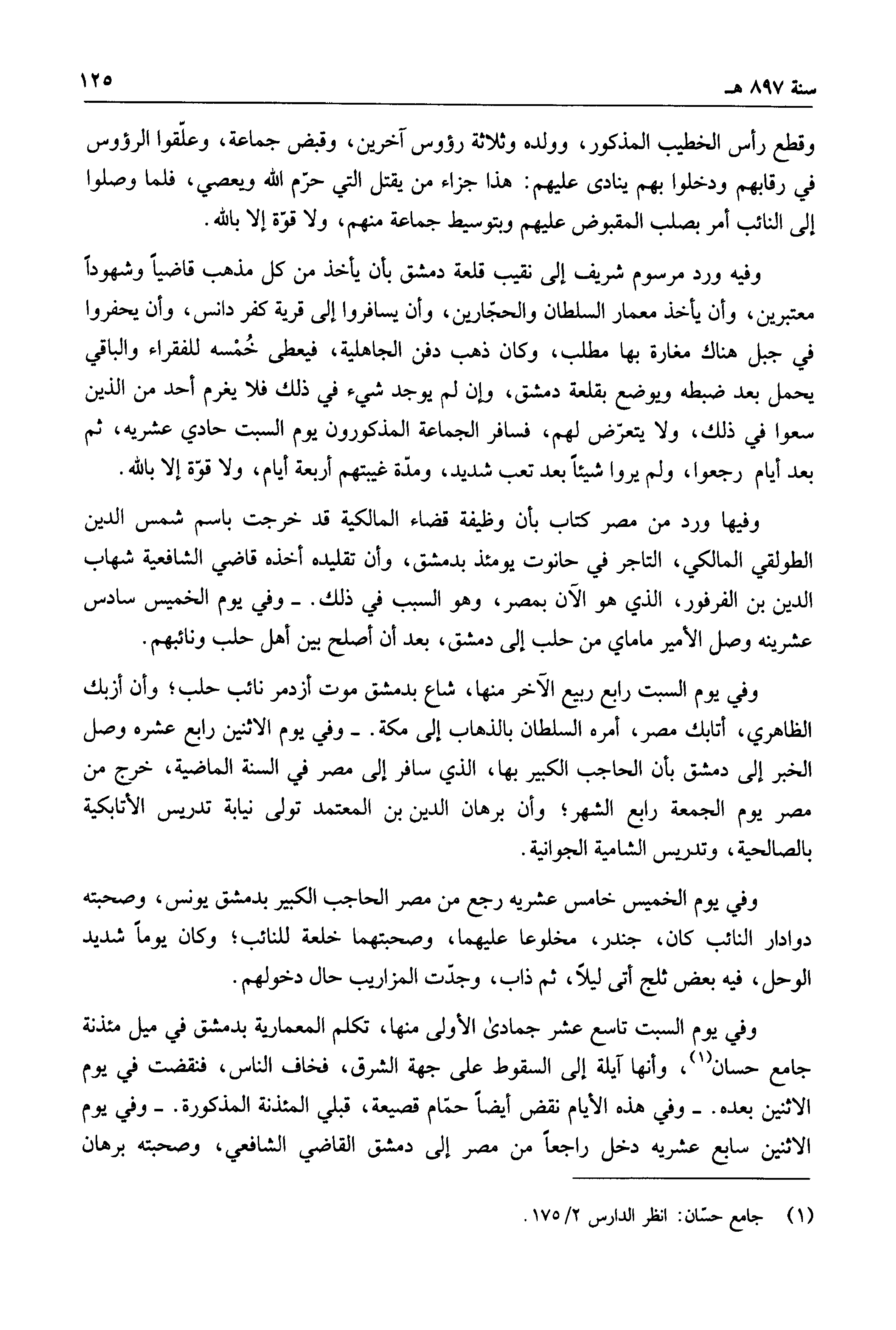 وفيه ورد مرسوم شريف إلى نقيب قلعة دمشق بأن يأخذ من كل مذهب قاضياًَ وشهوداً معتبرين، وأن يأخذ معمار السلطان والحجارين، وأن يسافروا إلى قرية كفر دانس، وأن يحفروا في جبل هناك مغارة بها مطلب، وكان ذهب دفن الجاهلية، فيعطى خمسه للفقراء والباقي يحمل بعد ضبطه ويوضع بقلعة دمشق، وإن لم يوجد شيء في ذلك فلا يغرم أحد من الذين سعوا في ذلك، ولا يتعرض لهم، فسافر الجماعة المذكورون يوم السبت حادي عشريه، ثم بعد أيام رجعوا، ولم يروا شيئاً بعد تعب شديد، ومدة غيبتهم أربعة أيام، ولا قوة إلا بالله.