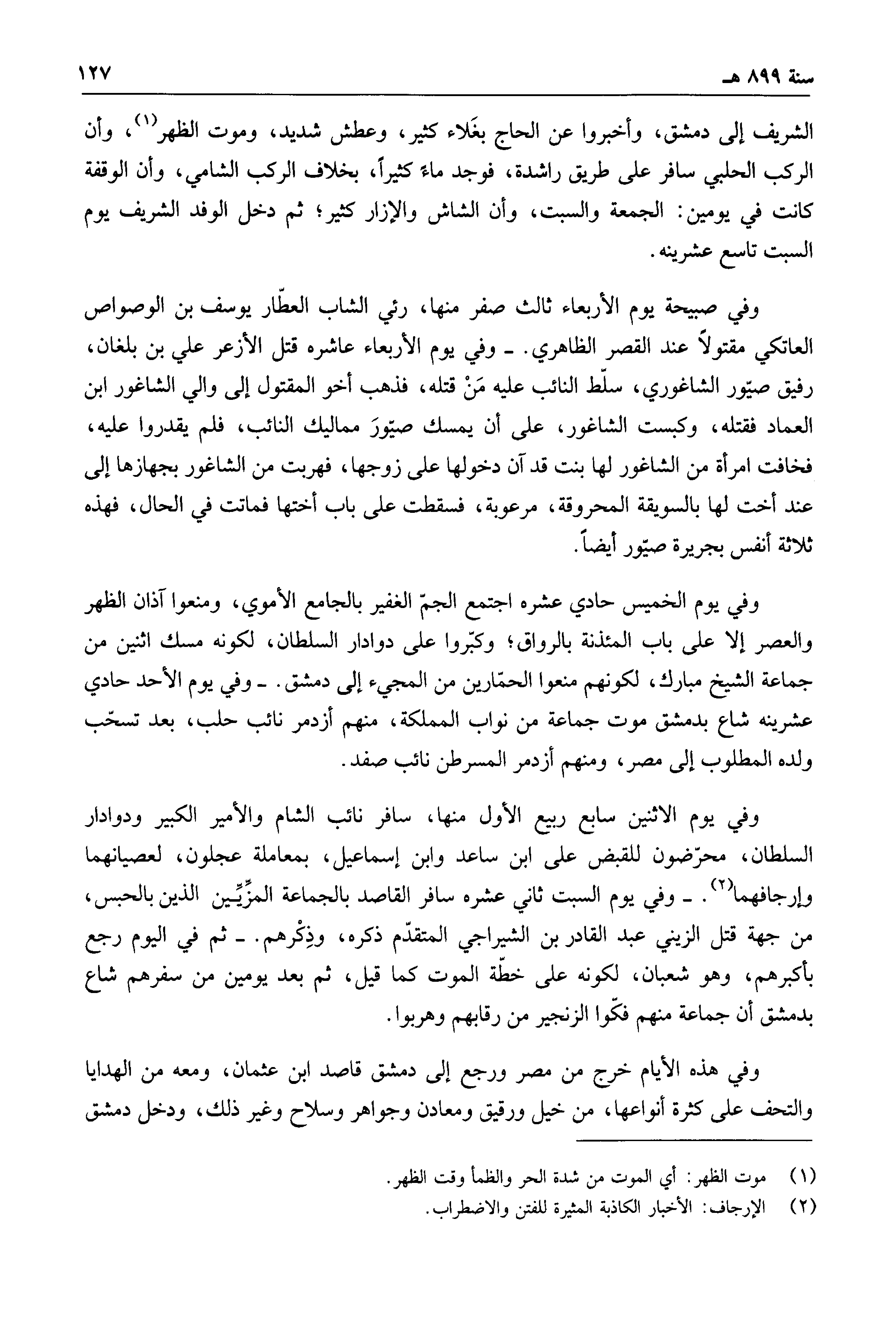 الشريف إلى دمشق، وأخبروا عن الحاج بغلاء كثير، وعطش شديد، وموت الظهر، وأن الركب الحلبي سافر على طريق راشدة، فوجد ماءً كثيراً، بخلاف الركب الشامي، وأن الوقفة كانت في يومين: الجمعة والسبت، وأن الشاش والإزار كثير؛ ثم دخل الوفد الشريف يوم السبت تاسع عشرينه.