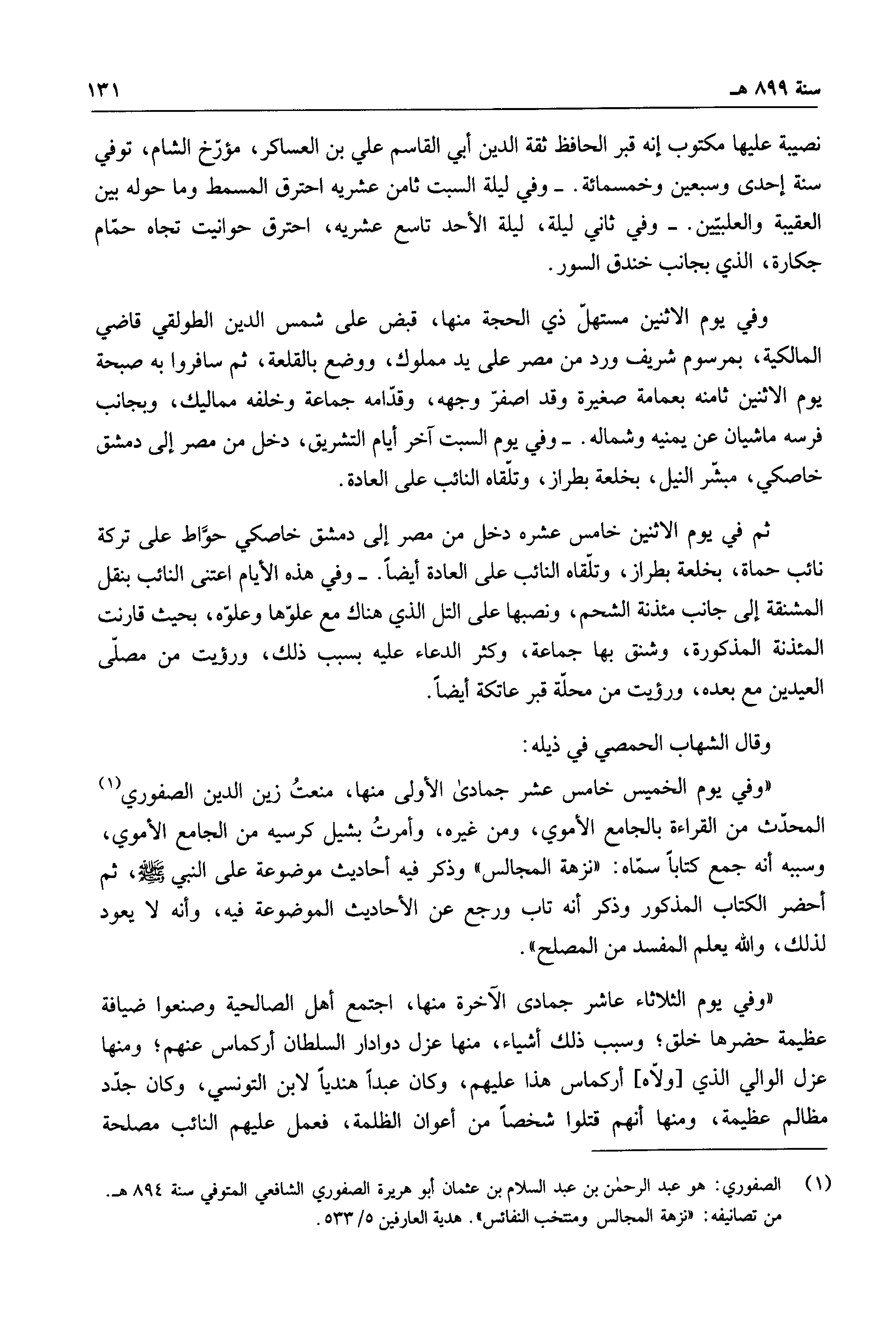 وقال الشهاب الحمصي في ذيله: وفي يوم الخميس خامس عشر جمادى الأولى منها، منعت زين الدين الصفوري، المحدث من القراءة بالجامع الأموي، ومن غيره، وأمرت بشيل كرسيه من الجامع الأموي، وسببه أنه جمع كتاباً سماه: نزهة المجالس وذكر في أحاديث موضوعة على النبي صلى الله عليه وسلم، ثم أحضر الكتاب المذكور وذكر أنه تاب ورجع عن الأحاديث الموضوعة فيه، وأنه لا يعود لذلك، والله يعلم المفسد من المصلح.