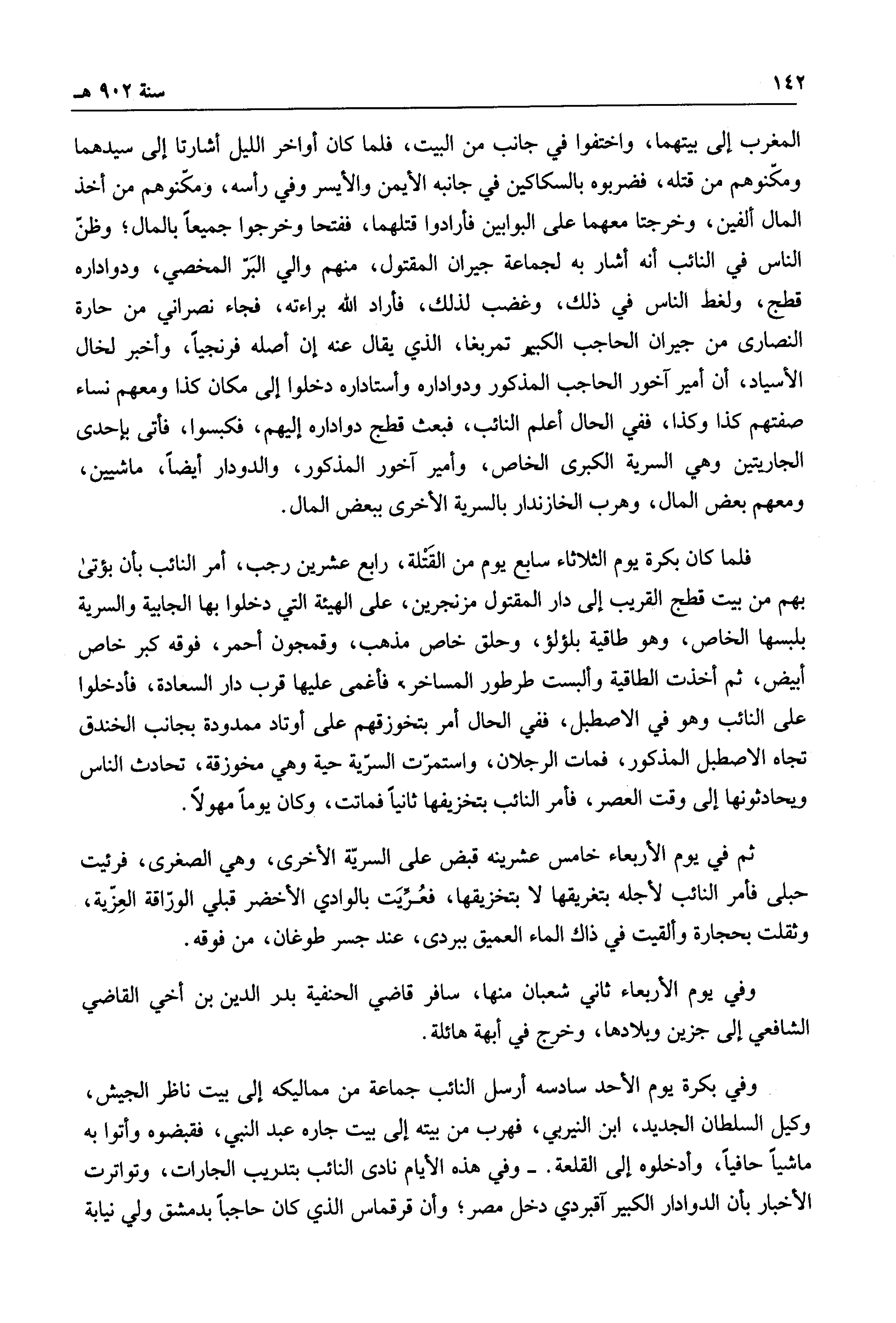 المغرب إلى بيتهما، واختفوا في جانب من البيت، فلما كان أواخر الليل أشارتا إلى سيدهما ومكنوهم من قتله، فضربوه بالسكاكين في جانبه الأيمن والأيسر وفي رأسه، ومكنوهم من أخذ المال ألفين، وخرجتا معهما على البوابين فأرادوا قتلهما، ففتحا وخرجوا جميعاً بالمال؛ وظن الناس في النائب أنه أشار لجماعة جيران المقتول، منهم والي البر المخصي، ودواداره قطج، ولغط الناس في ذلك، وغضب لذلك، فأراد الله براءته، فجاء نصراني من حارة النصارى من جيران الحاجب الكبير تمربغا، الذي يقال عنه إن أصله فرنجياً، وأخبر لخال الأسياد، أن أمير آخور الحاجب المذكور وأستاداره دخلوا إلى مكان كذا ومعهم نساء صفتهم كذا وكذا، ففي الحال أعلم النائب، فبعث قطج دواداره إليهم، فكبسوا، فأتى بإحدى الجاريتين وهي السرية الكبرى الخاص، وأمير آخور المذكور، والدوادار أيضاً، ماشيين، ومعهم بعض المال، وهرب الخازندار بالسرية الأخرى ببعض المال.