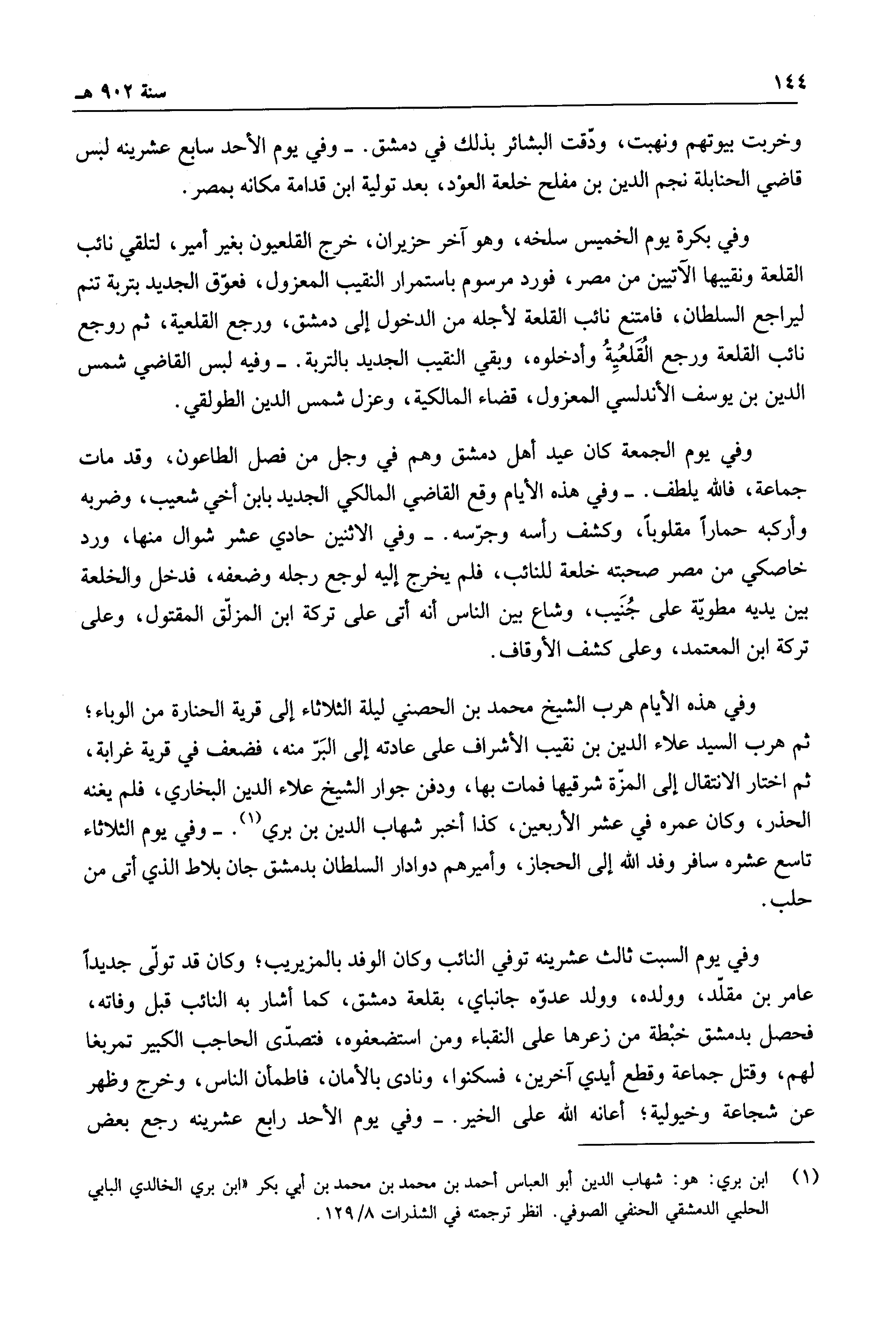 وفي يوم السبت ثالث عشرينه توفي النائب وكان الوفد بالمزيريب؛ وكان قد تولى جديداً عامر بن مقلد، وولده، وولد عدوه جانباي، بقلعة دمشق، كما أشار به النائب قبل وفاته، فحصل بدمشق خبطة من زعرها على النقباء ومن استضعفوه، فتصدى الحاجب الكبير تمربغا لهم، وقتل جماعة وقطع أيدي آخرين، فسكنوا، ونادى بالأمان، فاطمأن الناس، وخرج وظهر عن شجاعة وخيولية؛ أعانه الله على الخير.